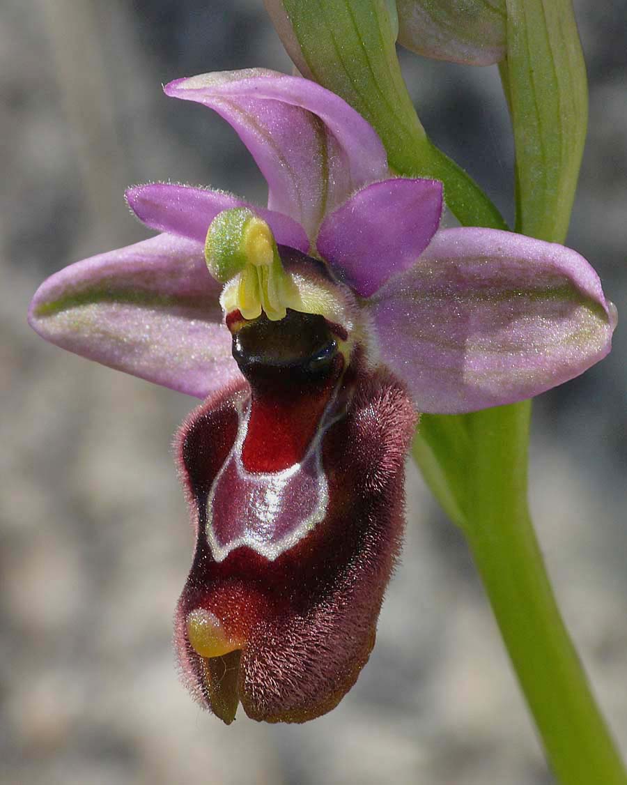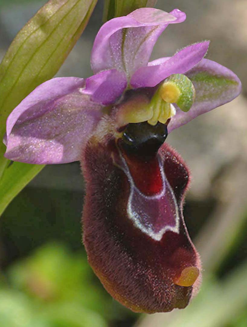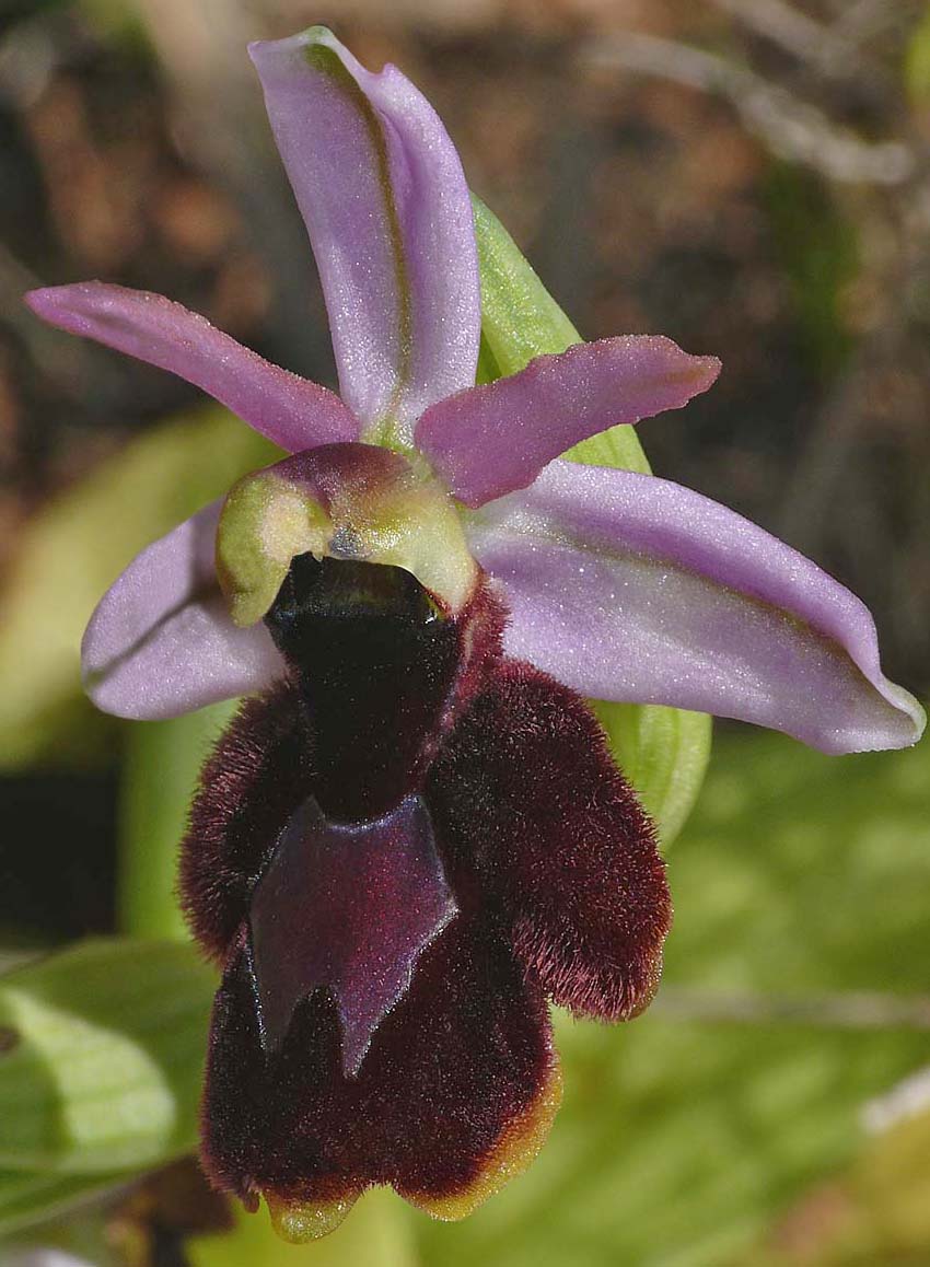 Given that O. baearica is endemic to the Balearics this is a hybrid that can only be found on the islands of Mallorca, Menorca and Ibiza, where it occurs rather commonly. Despite the fact that it is a relatively frequently encountered cross, it has not been formally described or named. It is an early flowerer, being in full bloom as early as mid March and declining by mid April. Preferred habitat is always calcareous but unlike both its parents which tolerate a degree of shade, it seems to prefer a position in full sun. These hybrids can be variable but are typically very hirsute and colouration is invariably a reddish dark brown that may or may not shade into a yellow marginal band. The speculum will sometimes comprise a bib and contrasting basal field but it is far more usual to see a simple stand alone shield as in O. balearica itself. Both of its progenitors carry a wholly or predominantly black stigmatic cavity and so it is unsurprising therefore that such is the case with the cross. Where a plant is discovered with a greenish or brownish stigmatic cavity it is probable that the parents are O. balearica and the second O. tenthredinifera group representative in the Balearics, O. spectablis. This particular cross could however be found only on Mallorca as O. spectablis does not occur on the smaller islands of the archipelago. The pictures come from Mallorca , dating from the first week of April. |