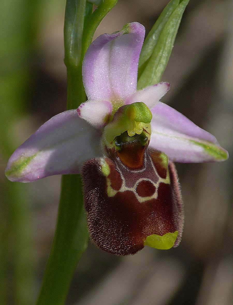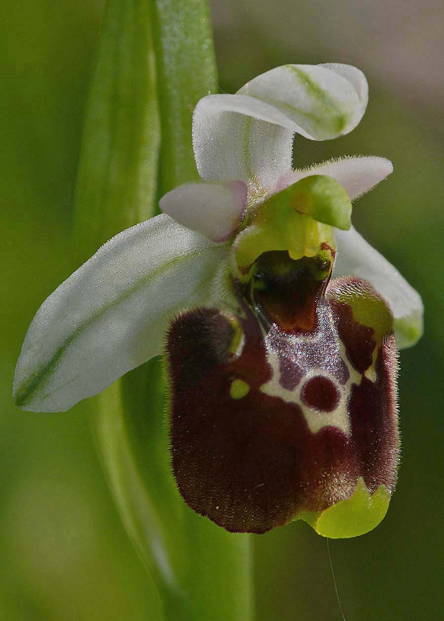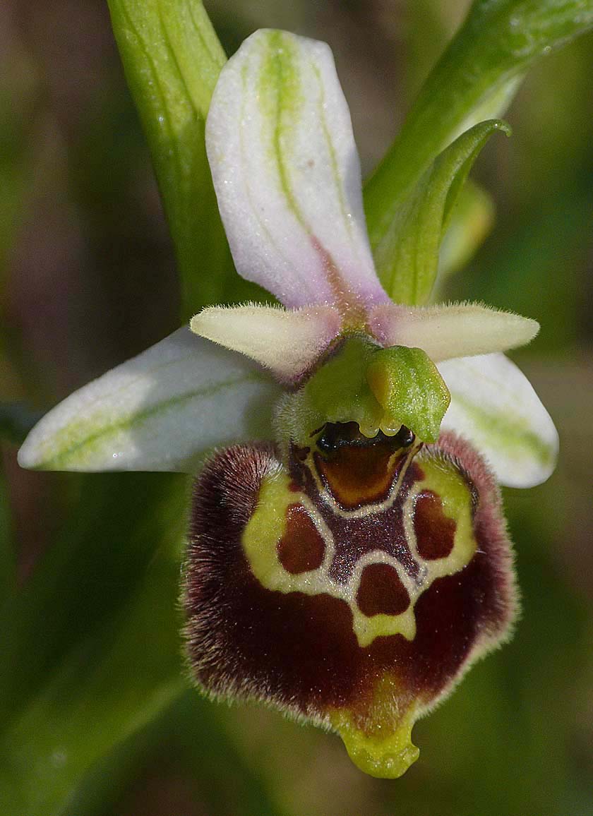 This species was originally thought to be endemic to Croatia, having a limited distribution in Istria and localised areas of the central Dalmation coast, it has recently however been found in the central Apennines of Italy. O. tetraloniae is the last of the Croatian fuciflorid species to flower, coming in to bloom from mid May, at least two weeks after O. medea and perhaps a month after O. untchjii. Commencing in late May, it is not at its best until mid June at a time when other Croatian orchid specialities will be long gone. The pictures here date from the second week of May when very few O. tetraloniae had appeared and we were lucky to find just three plants and three flowers that were sufficiently advanced. Flowering time is a key factor in identification but their are other characteristics that are helpful. The basal swellings can be little more than raised bumps or at best, very reduced horns and this contrasts significantly with the normally strong, sometimes robust lateral lobes of the other Croatian fuciflorids. The sepals are most frequently white, though pink is not uncommon and green not unheard of. The overall lip shape is very square in mature plants, though this is not particularly well depicted in these photographs, which are all of newly opened flowers. The appendage is pointed with three distinct teeth unlike O. untchjii and O. medea where the appendage is multi-toothed. The pictures are from Istria, dating from the 10th of May. |