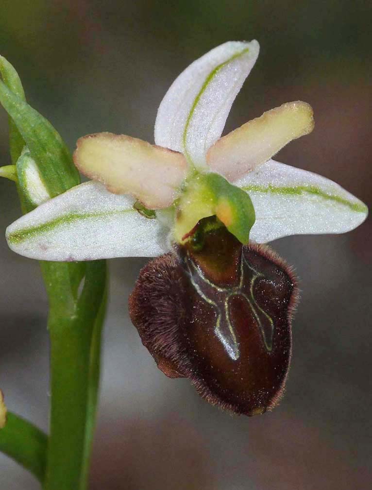 reintroducing the taxon as O. exaltata subsp. tyrrhena and in 2001 Delforge described it in his then newly produced reference book as a full species, naming it O. montis-leonis. Expert opinion is still divided as to the status of this Ophrys, but given that its pollinator has been identified and that it appears to grow independently from the species assumed to be its progenitors, we continue assuming it to be a full species. Descriptions of this taxon are difficult due to the high degree of variation exhibited, this variation being attributed to its hybrid origins that are thought to involve species from the O. fuciflora and O. exaltata groups. Morphologically O. tyrrhena can display characteristics from either or both of these groups but most frequently it favours its O. exaltata progenitor, as depicted in the pictures accompanying this text. It is endemic to Italy being found over a wide area stretching from the Ligurian coast down to Rome. The photos come from an area of Tuscany 20 miles inland from Grosetto and date from the first week of May, at a time towards the end of their flowering cycle. |