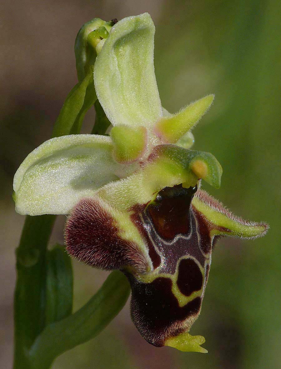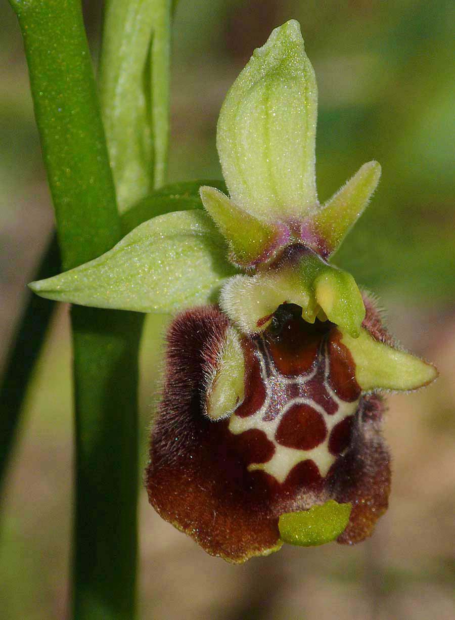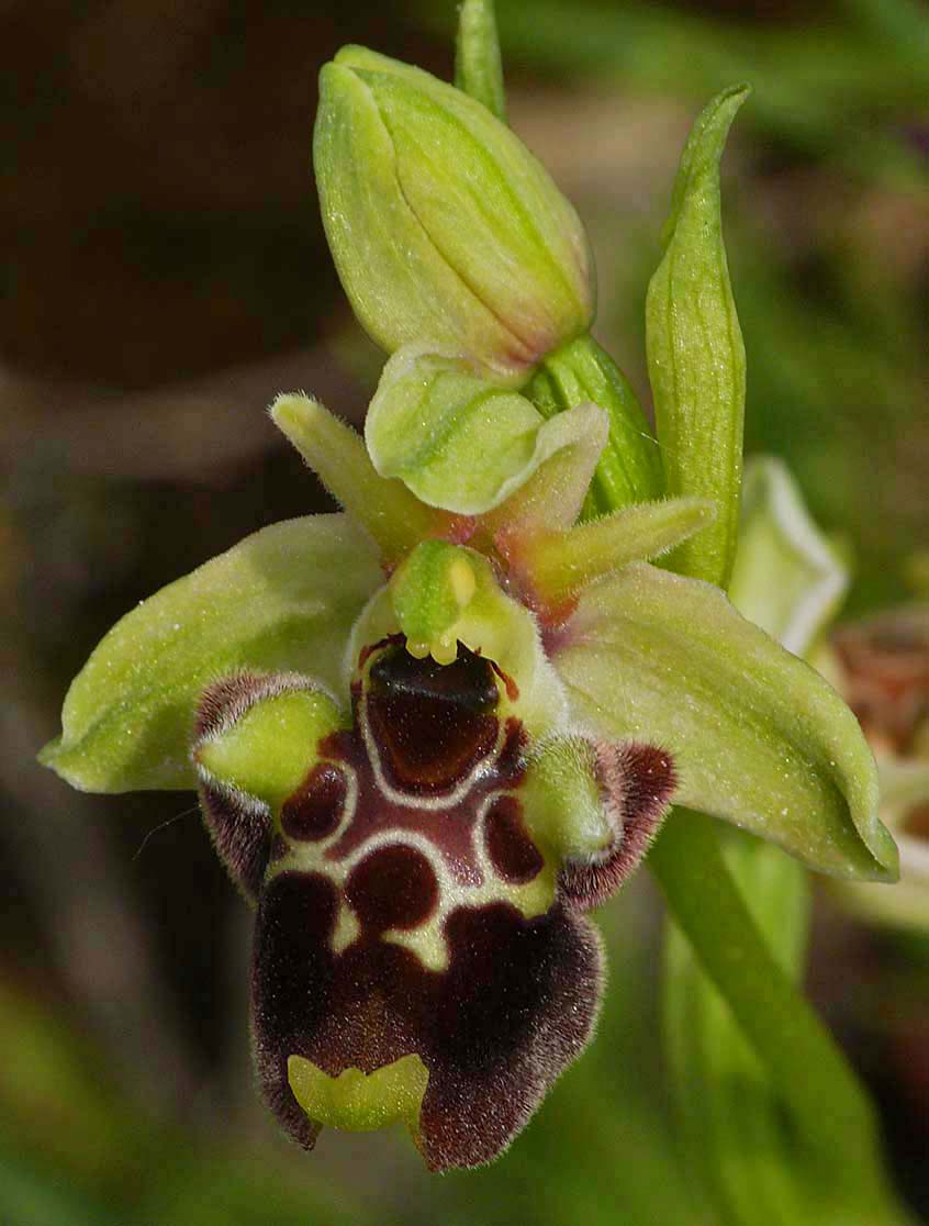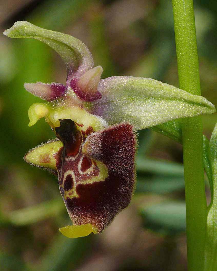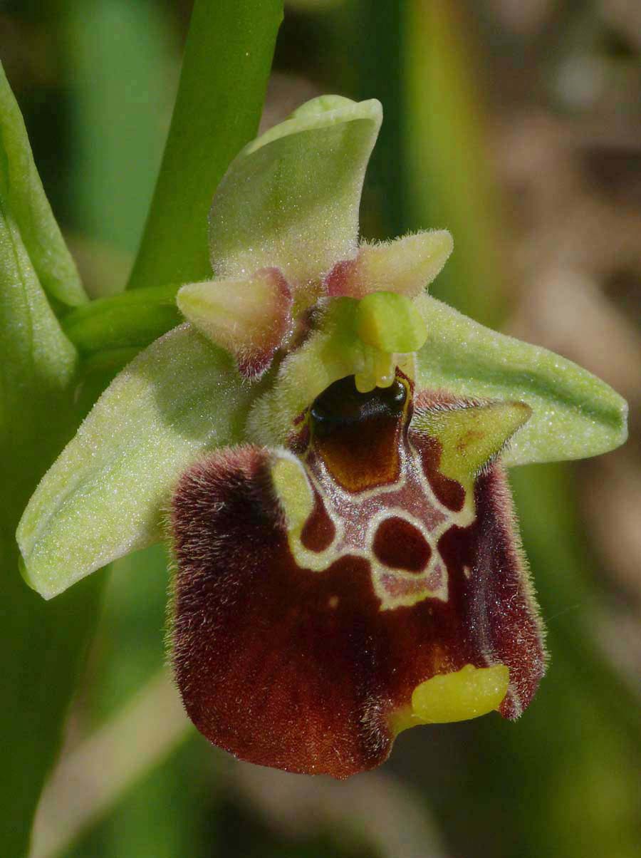 This species is thought to be endemic to Croatia, having a limited distribution in Istria, the larger islands of the Quarnero archipelago and localised areas of the central Dalmation coast around Split. Along with the newly described and larger O. istriensis, it is the first of the Croation fuciflorid species to flower, coming in to bloom in mid April, at least two weeks before O. medea and perhaps a month before O. dinarica and O. tetraloniae. It is not an uncommon species, being found in short grassland and abandoned terraces on most suitable calcareous substrates, particularly those with a moisture retentive character. O. untchjii has a relatively long flowering period, spanning that of the other fuciflorids. Hybridization is therefore widespread and identification often complicated. One of the characteristic features of this Ophrys is the green perianth, an attribute which although once thought to be unique amongst Istrian species is now known to be shared with O. istriensis. In any event this feature is not totally reliable as the sepals can occasionally be white and in southern Istria, often pink. In the case of the latter colouration their is the possibility of confusion with O. fuciflora itself but they may be differentiated by the smaller size and proportionately larger appendage of O. untchjii. Unlike O. medea and O. tetraloniae, this is a robust plant which can carry a large number of individual flowers and often grow in clumps. The flowers themselves are small with a distinctive transverse white bar joining the psuedo-eyes. The pictures date from the first week of May. |