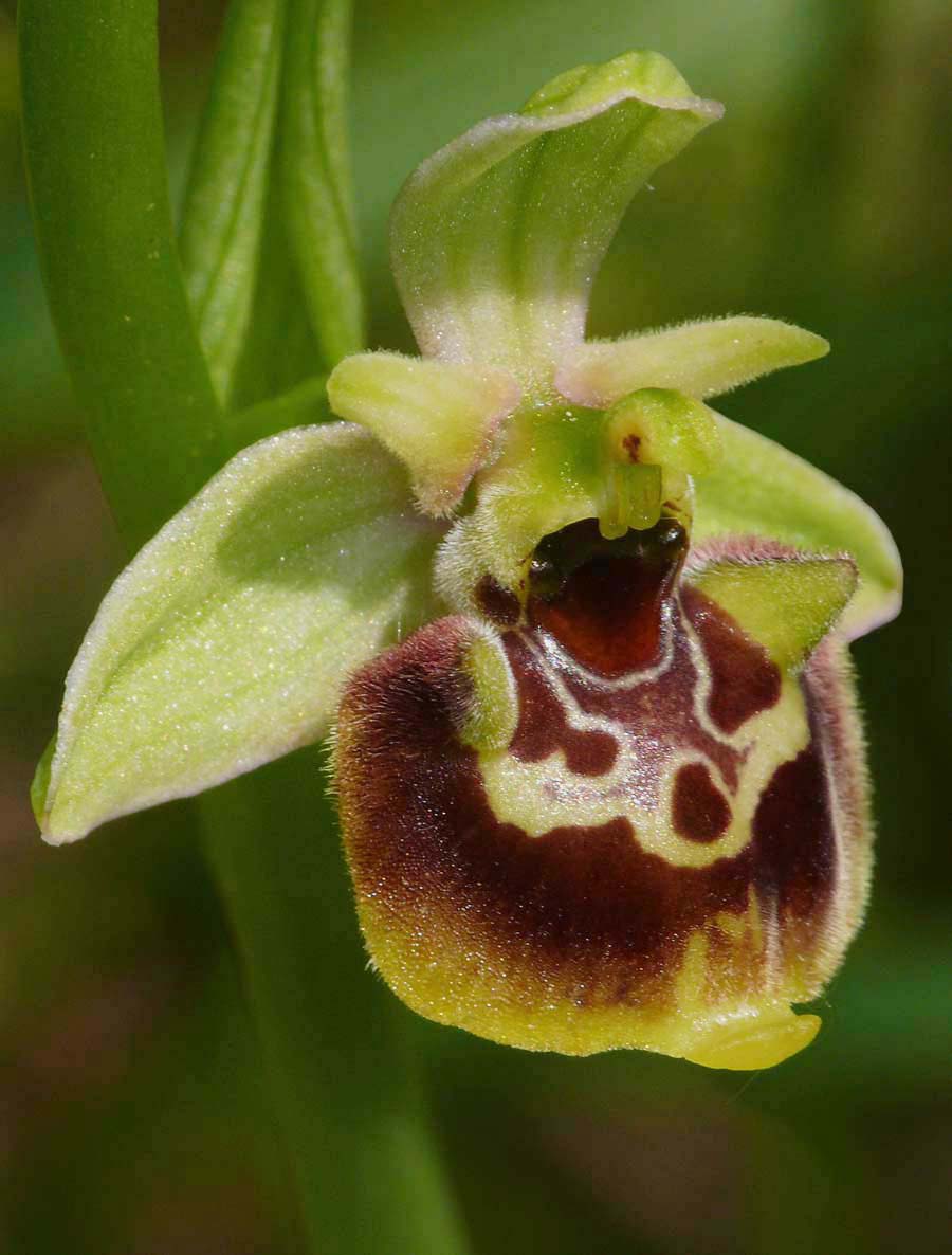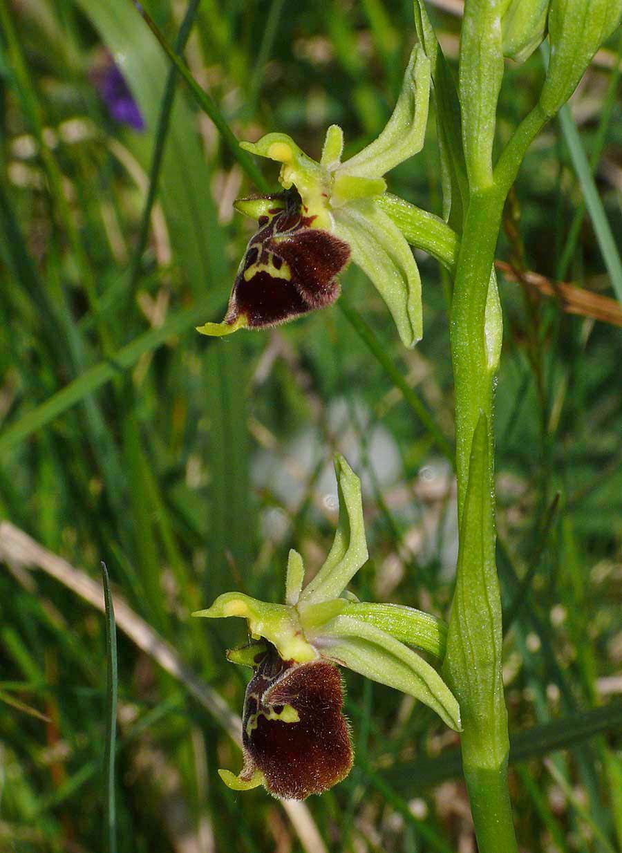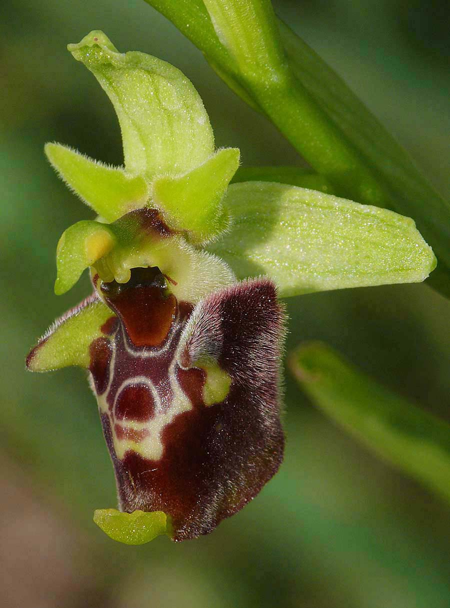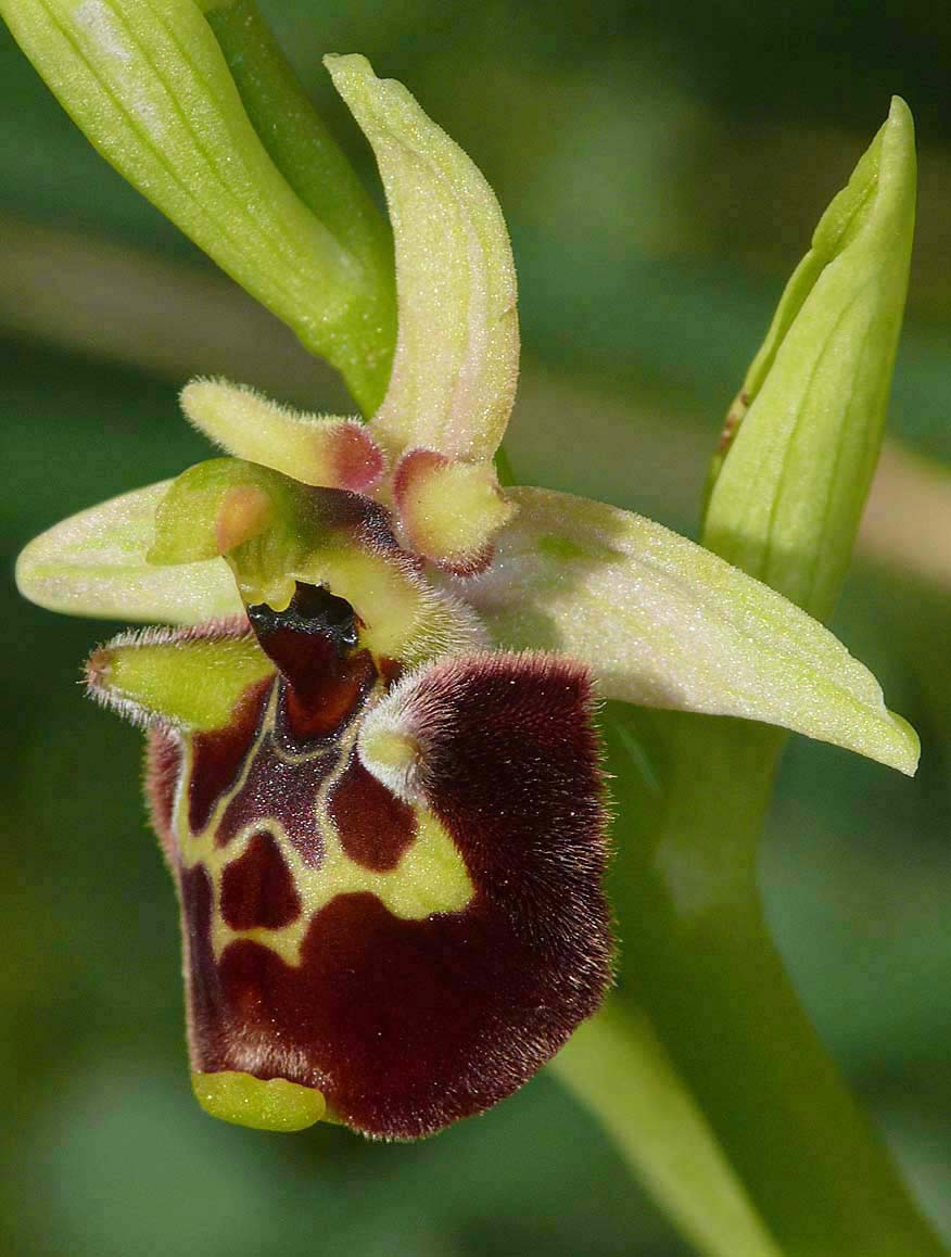 This species is thought to be endemic to Croatia, having a limited distribution in Istria, the larger islands of the Quarnero archipelago and localised areas of the central Dalmation coast around Split. Along with the newly described and larger O. istriensis, it is the first of the Croation fuciflorid species to flower, coming in to bloom in mid April, at least two weeks before O. medea and perhaps a month before O. dinarica and O. tetraloniae. It is not an uncommon species, being found in short grassland and abandoned terraces on most suitable calcareous substrates, particularly those with a moisture retentive character. O. untchjii has a relatively long flowering period, spanning that of the other fuciflorids. Hybridization is therefore widespread and identification often complicated. One of the characteristic features of this Ophrys is the green perianth, an attribute which although once thought to be unique amongst Istrian species is now known to be shared with O. istriensis. In any event this feature is not totally reliable as the sepals can occasionally be white and in southern Istria, often pink. In the case of the latter colouration their is the possibility of confusion with O. fuciflora itself but they may be differentiated by the smaller size and proportionately larger appendage of O. untchjii. Unlike O. medea and O. tetraloniae, this is a robust plant which can carry a large number of individual flowers and often grow in clumps. The flowers themselves are small with a distinctive transverse white bar joining the psuedo-eyes. The pictures date from the first week of May. |