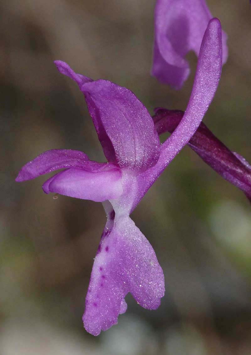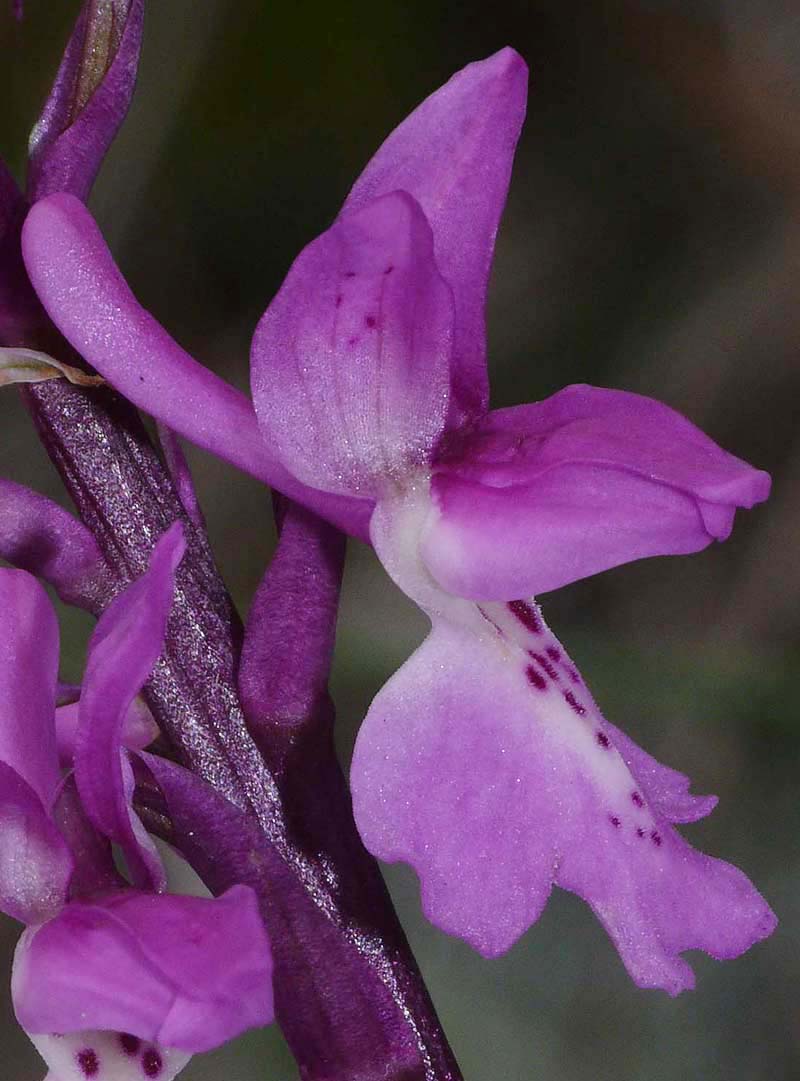 It is a western Mediterranean species found predominantly in the Iberian peninsula, southern France and north Africa but with smaller populations in Corsica, Balearics and Liguria. Although local, it is widespread and can be relatively common in its favoured locations, these being dry, calcareous soils in either full sun or within open woodland. One of the key identification characteristics is its early flowering, where in the warmer parts of its range and particularly coastal districts, it is quite possible to find O. olbiensis in full flower by the middle of March. This species is usually spindly with a lax flower head of no more than fifteen individual flowers that can vary in colouration from deep red to white. The flowers are heavily marked with mauve spots or streaks and the borders of the lip present a somewhat ragged appearance. The leaves form a loose basal rosette and are usually unmarked although as can be seen in picture 11, they can occasionally carry heavy, dark purple blotching. The flowers are small for the group but unusually carry a light but nonetheless pleasant scent. The spur is longer than the ovary and always pointed upwards. The illustrations are from southern Spain, Mallorca and southern France, dating from the end of March to the beginning of April. |
