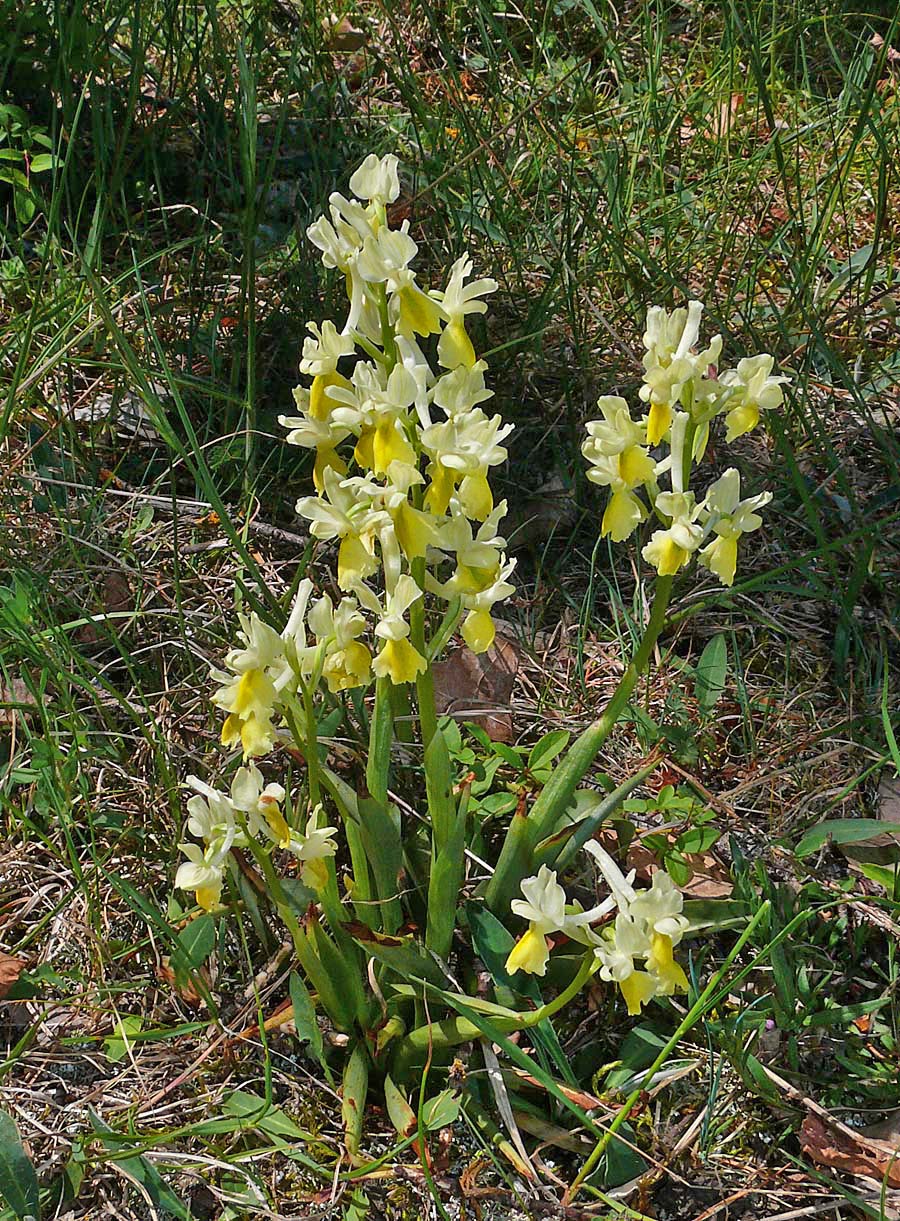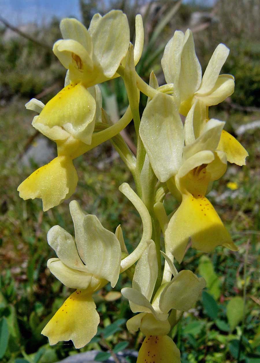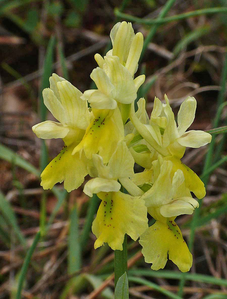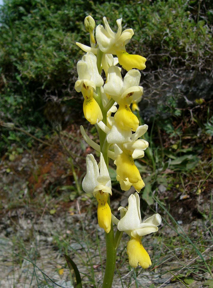 Orchis pauciflora was first described by Tenore from Naples in 1811 and its name refers to the small number of flowers carried by individual plants. This feature is responsible for the species common name, the Sparse Flowered Orchid. Whilst this description is generally valid, O. pauciflora can on occasion exhibit a long and denser than normal inflorescence as may be seen in photo 10. Where the plant grows in its preferred habitat of hilly/mountainous ground in light woodland or scrub. it tends to be short and few flowered whilst at lower elevations it grows more vigorously and can frequently reach as much as 30cms. O. pauciflora is a distinctive plant but one which can easily be confused with several other species such as O. provincialis and the yellow flowered form of D. sambucina, both of which share the preference for upland habitat. The former species is usually a leggier plant with off white flowers which although occasionally of a more yellow hue, are a far less sulphurous shade. O. provincialis is also distinguished by its heavily spotted leaves. D. sambucina is also less intensely yellow but more importantly has the typical Dactylorhiza bract formation appearing through the inflorescence. O. pallens is another similar species that has an overlapping range but is a far rarer orchid with very robust, rounded leaves forming a basal rosette. The most significant differentiating feature however is the flower of this species which completely lacks any lip markings.