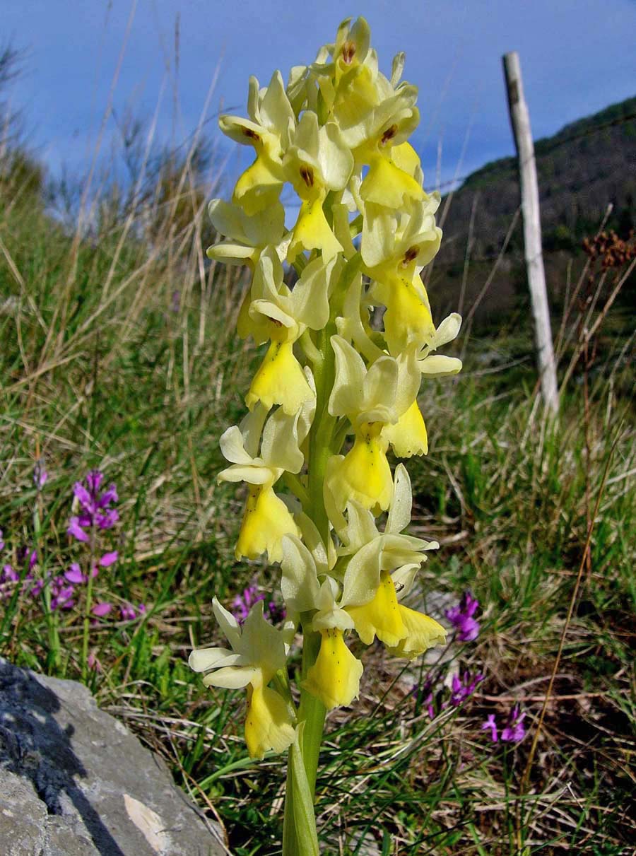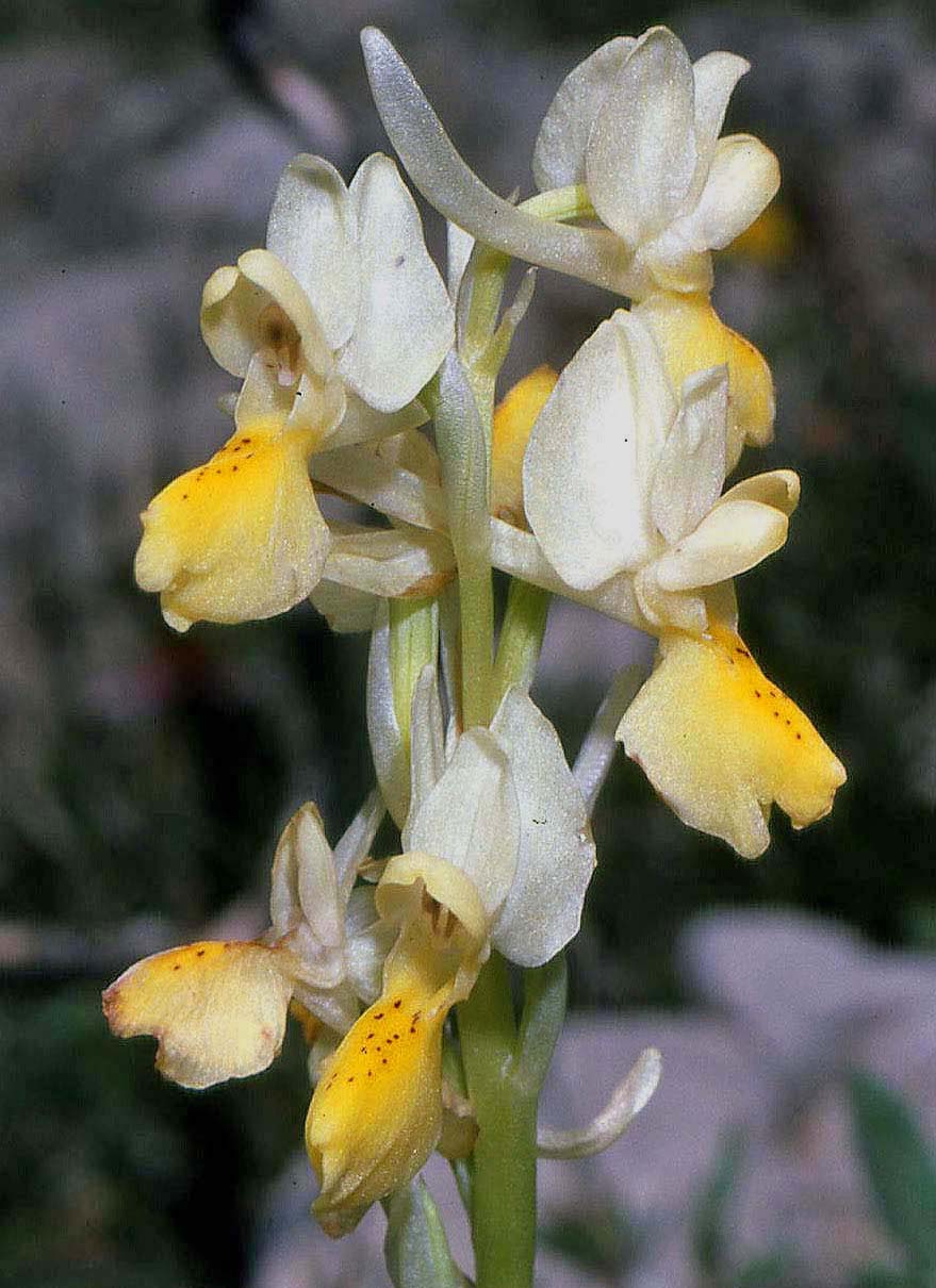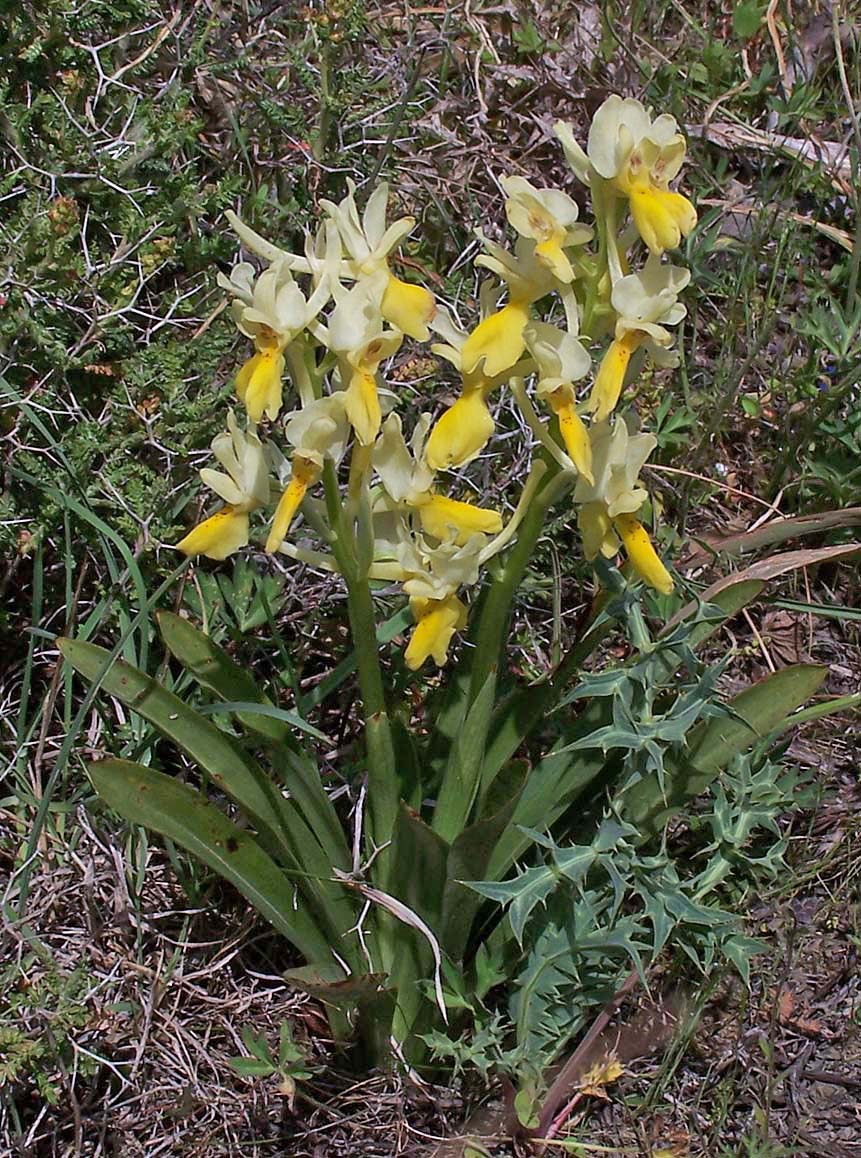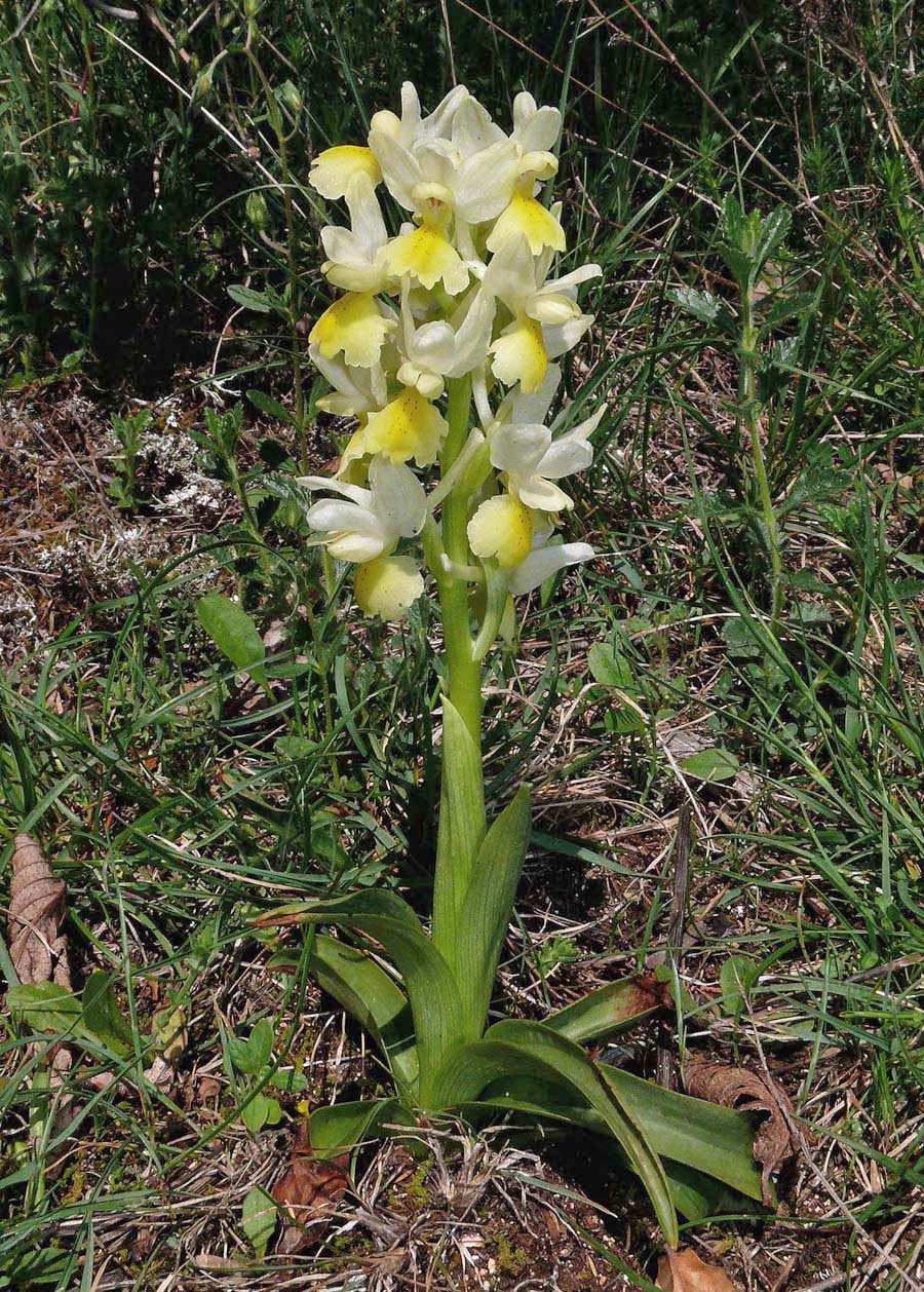 Orchis pauciflora was first described by Tenore from Naples in 1811 and its name refers to the small number of flowers carried by individual plants. This feature is responsible for the species common name, the Sparse Flowered Orchid. Whilst this description is generally valid, O. pauciflora can on occasion exhibit a long and denser than normal inflorescence as may be seen in photo 10. Where the plant grows in its preferred habitat of hilly/mountainous ground in light woodland or scrub. it tends to be short and few flowered whilst at lower elevations it grows more vigorously and can frequently reach as much as 30cms. O. pauciflora is a distinctive plant but one which can easily be confused with several other species such as O. provincialis and the yellow flowered form of D. sambucina, both of which share the preference for upland habitat. The former species is usually a leggier plant with off white flowers which although occasionally of a more yellow hue, are a far less sulphurous shade. O. provincialis is also distinguished by its heavily spotted leaves. D. sambucina is also less intensely yellow but more importantly has the typical Dactylorhiza bract formation appearing through the inflorescence. O. pallens is another similar species that has an overlapping range but is a far rarer orchid with very robust, rounded leaves forming a basal rosette. The most significant differentiating feature however is the flower of this species which completely lacks any lip markings.