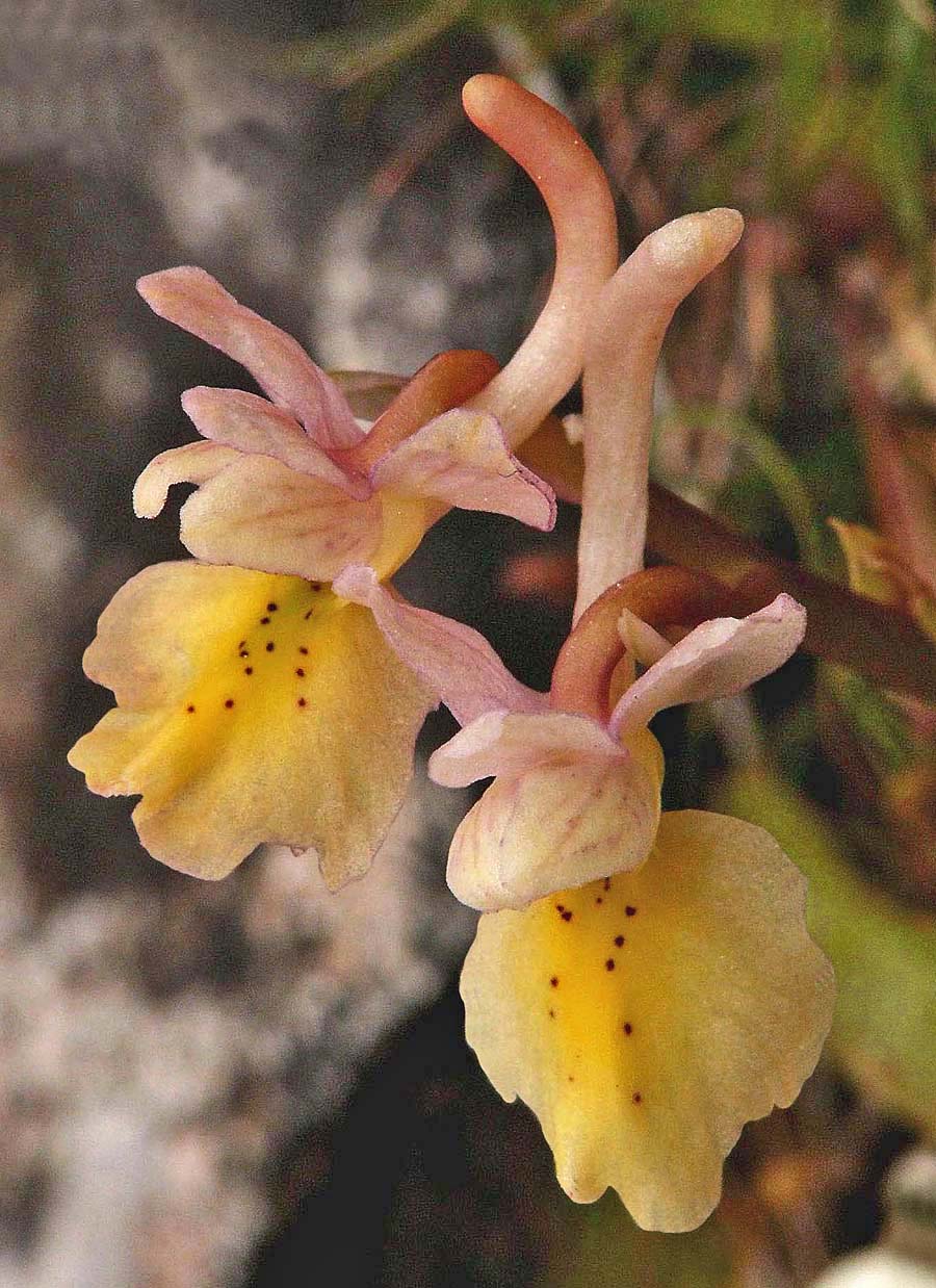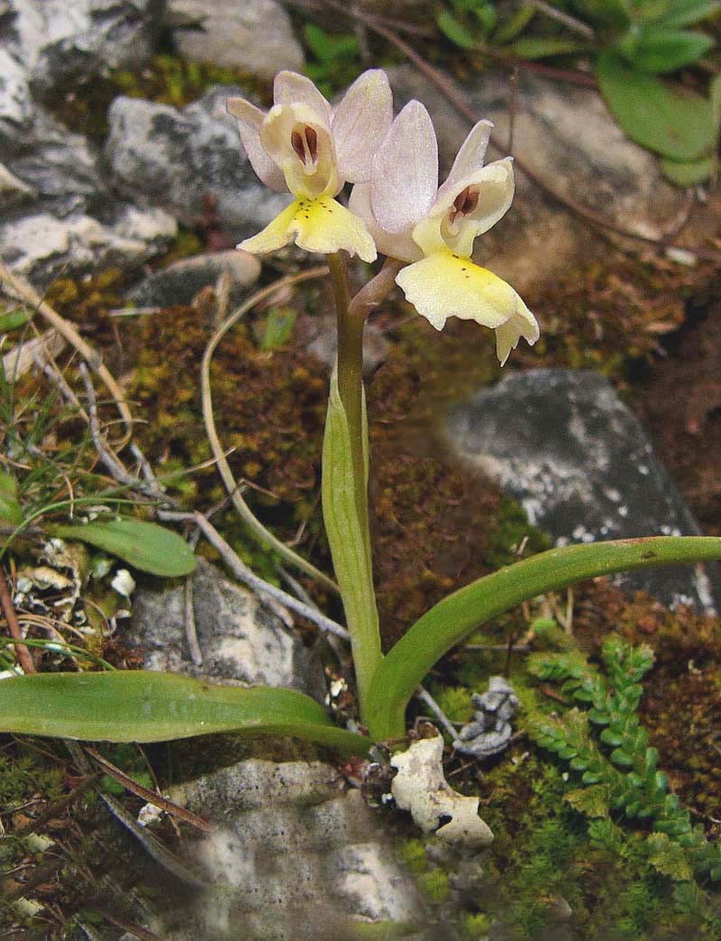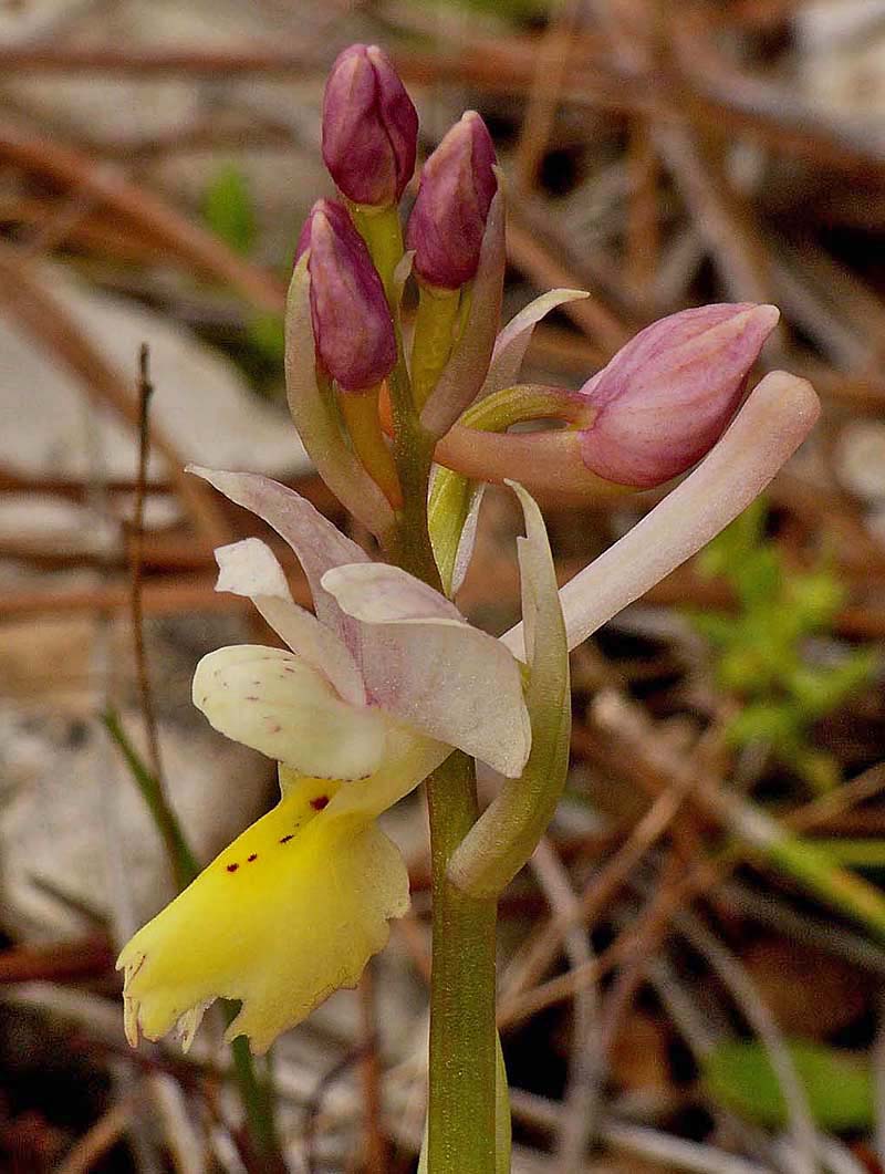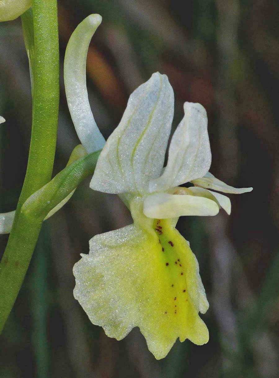 Orchis pauciflora was first described by Tenore from Naples in 1811 and its name refers to the small number of flowers carried by individual plants. This feature is responsible for the species common name, the Sparse Flowered Orchid. Whilst this description is generally valid, O. pauciflora can on occasion exhibit a long and denser than normal inflorescence as may be seen in photo 10. Where the plant grows in its preferred habitat of hilly/mountainous ground in light woodland or scrub. it tends to be short and few flowered whilst at lower elevations it grows more vigorously and can frequently reach as much as 30cms. O. pauciflora is a distinctive plant but one which can easily be confused with several other species such as O. provincialis and the yellow flowered form of D. sambucina, both of which share the preference for upland habitat. The former species is usually a leggier plant with off white flowers which although occasionally of a more yellow hue, are a far less sulphurous shade. O. provincialis is also distinguished by its heavily spotted leaves. D. sambucina is also less intensely yellow but more importantly has the typical Dactylorhiza bract formation appearing through the inflorescence. O. pallens is another similar species that has an overlapping range but is a far rarer orchid with very robust, rounded leaves forming a basal rosette. The most significant differentiating feature however is the flower of this species which completely lacks any lip markings.