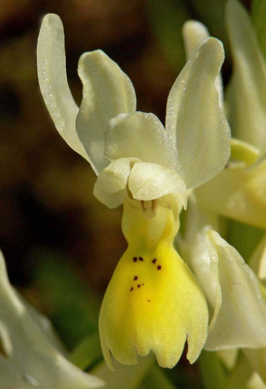 As has already been mentioned above, O. pauciflora will readily hybridize and it's therefore no surprise that a species with which it frequently occurs, O. quadripunctata is also one of the most commonly experienced crosses (another being with O. mascula forming O. x colemanii). The following three photos are all from high up on Mount Hymettus near Athens. In this particular area there was a high incidence of hybridisation but despite considerable study, all plants so affected, were noted to have retained far more O. pauciflora characteristics than of O. quadripunctata. It is entirely possible that this population was in fact a rare occurence of Orchis hybridogeny similar to that more frequently seen with Serapius and Dactylorhiza. | ||
