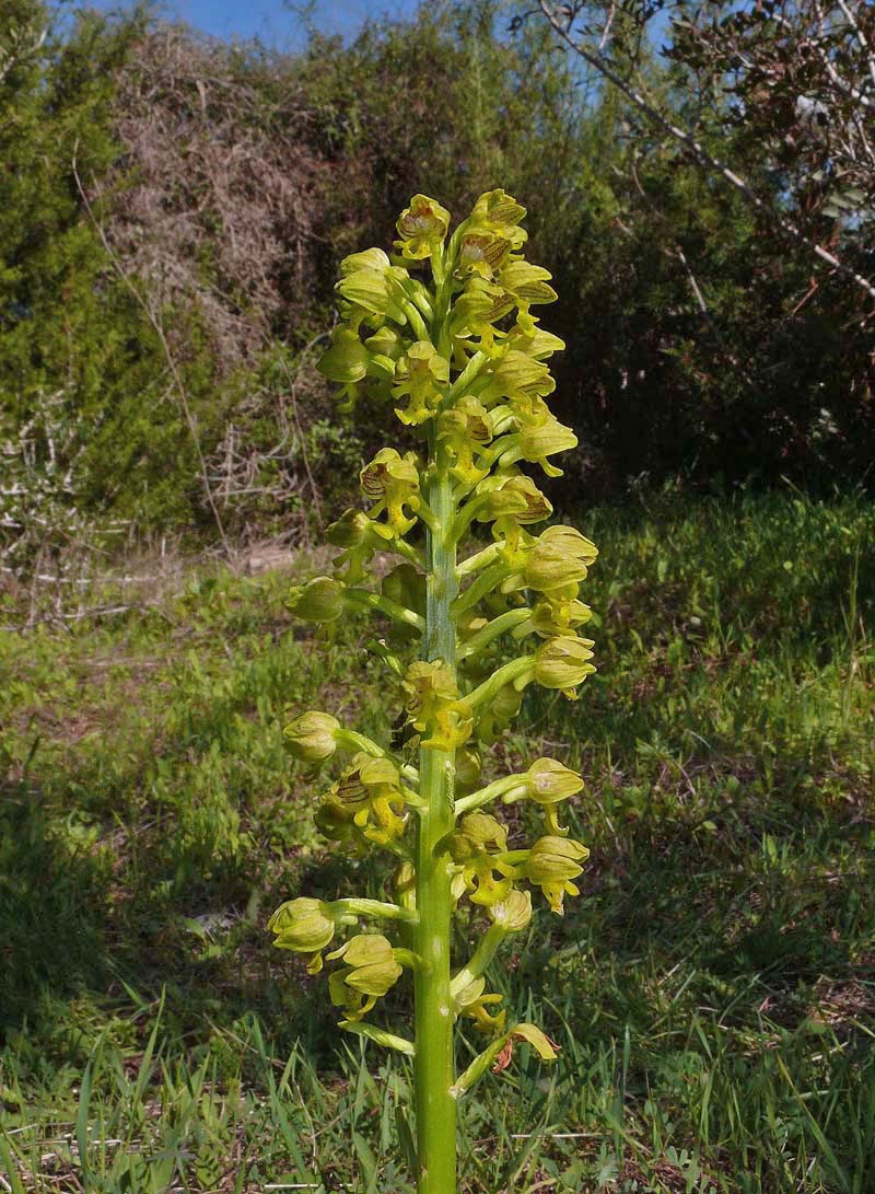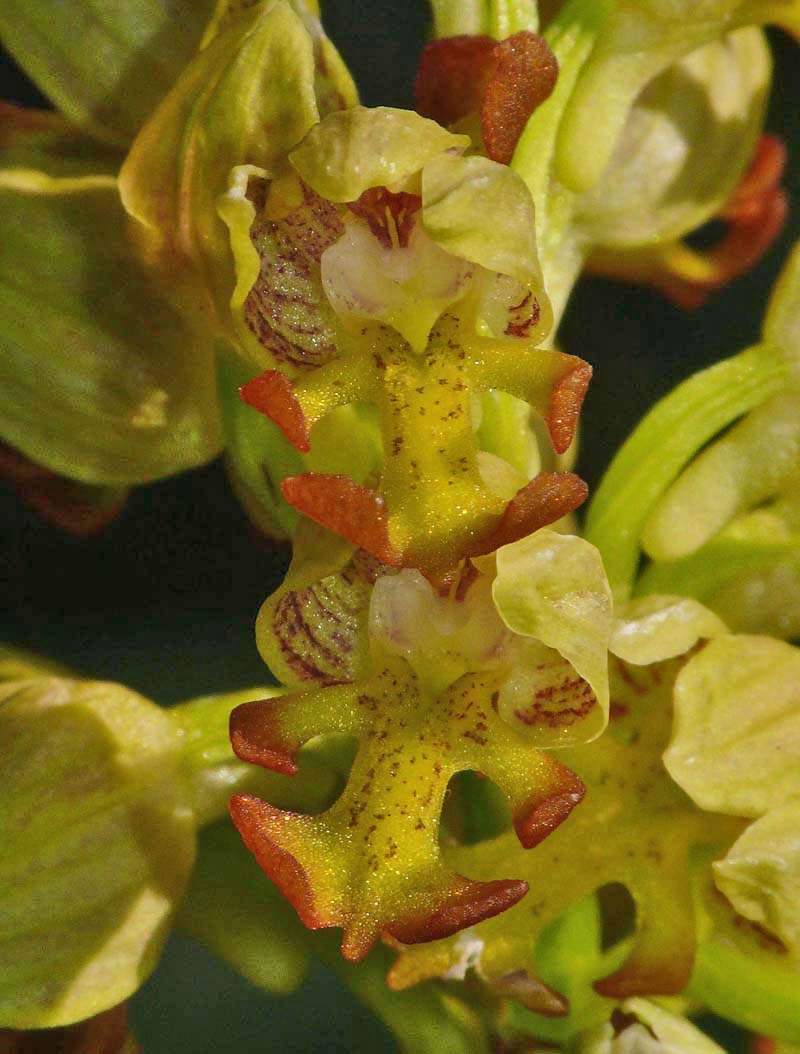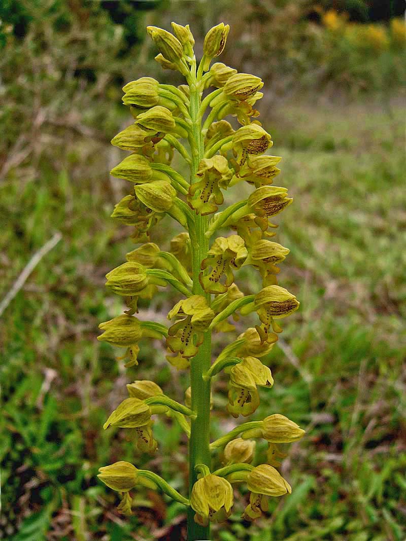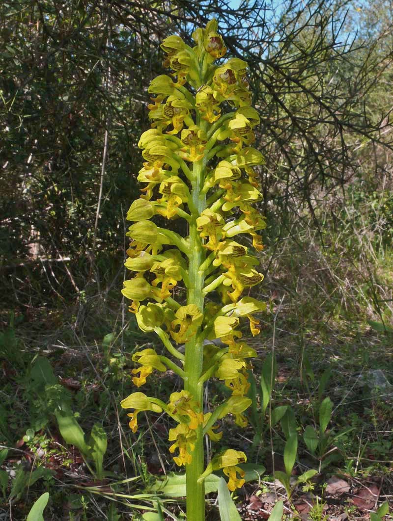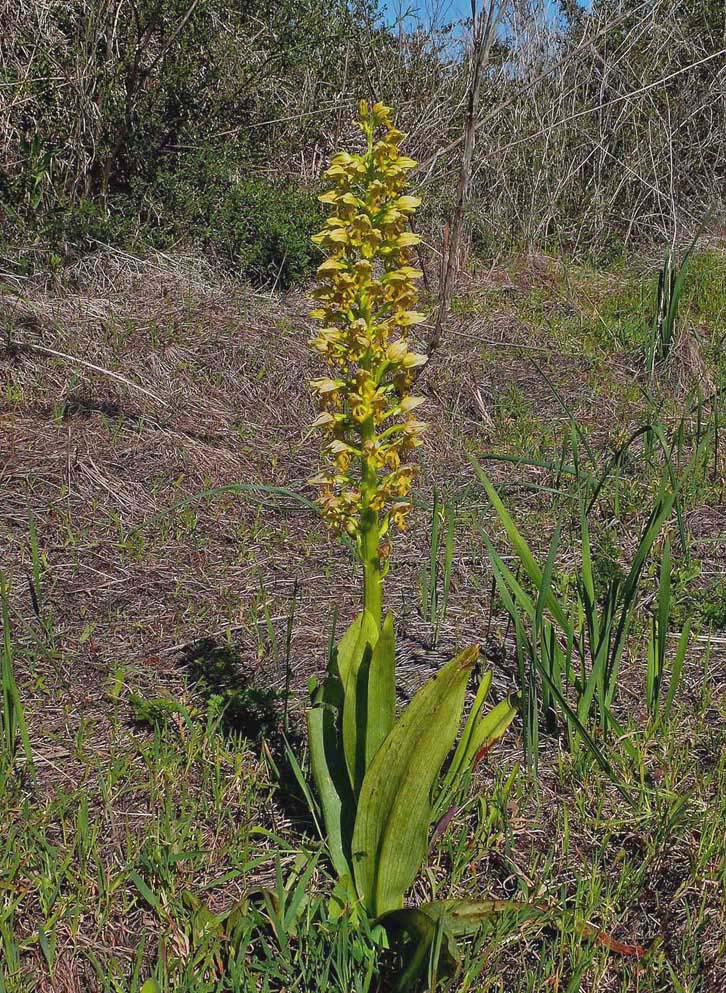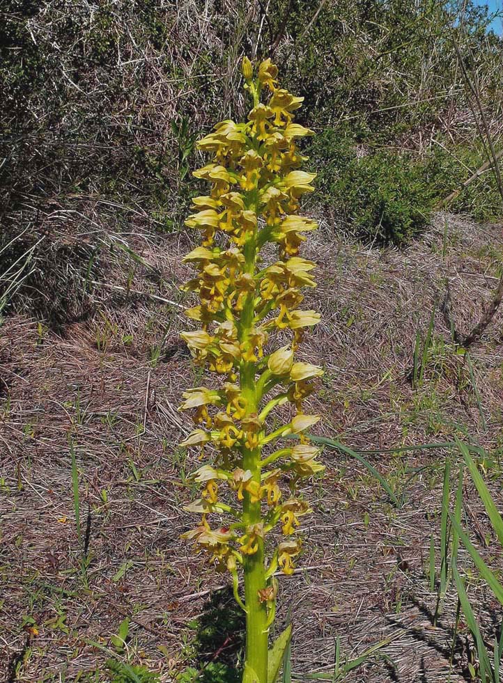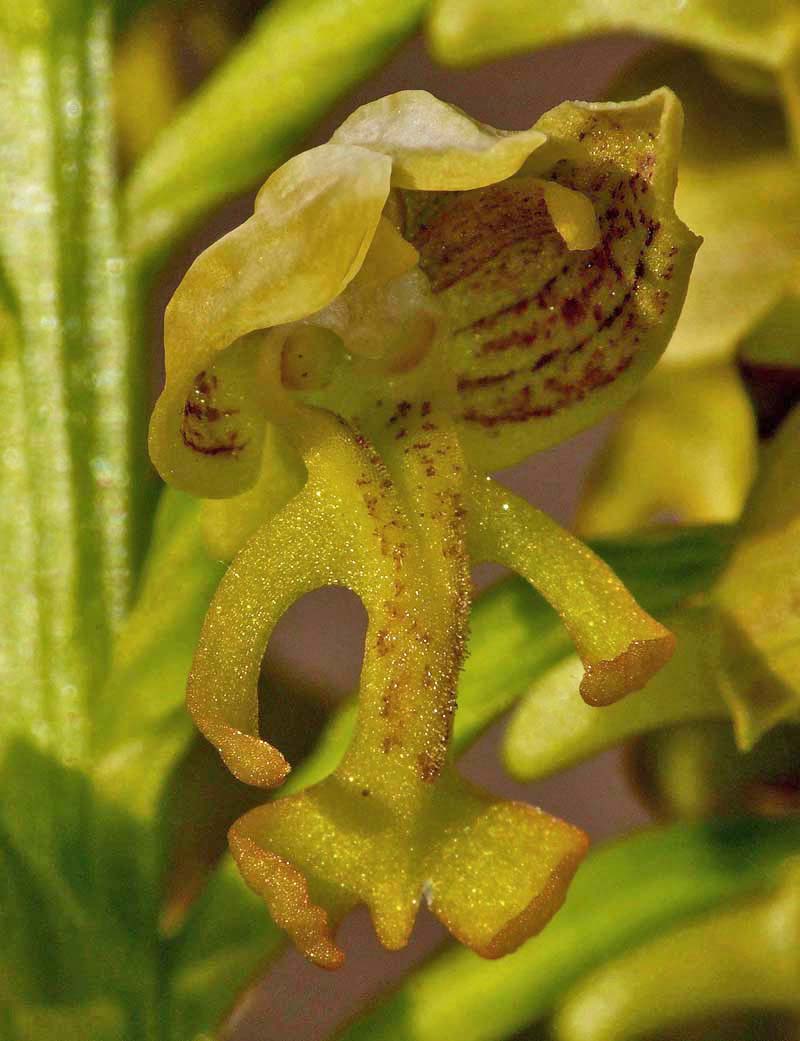 This species was first described from the Crimea (then Russia) in 1835 and is a member of the eleven strong O. militaris group whose name refers to the red spotting on the flowers. O. punctulata is undoubtedly one of Europes most impressive orchids and also one of its rarest with an eastern Mediterranean range from Greece in the west to Iran in the east. It is perhaps most familiar to Western European orchidologists as one of the specialties of the island of Cyprus where it seems destined to become still rarer due to habitat loss from apparently unrestricted tourist development. Its stronghold on the island is in the hills of the Akamas peninsula where with perseverance it is still quite possible to encounter the species without specialist site information. Its main sites seem to be reasonably well known and frequently visited in early March. This close attention doesn't however seem to be particularly detrimental but the already mentioned, threat from tourist development is far more challenging. The pictures accompanying this text are from a site containing some 50 plants but which was within just two hundred yards of coastal apartment complexes. The species is quite variable and most particularly in the flower colouration which can vary from an almost lime green to a much darker reddish, brown. The variant sepulchris from Anatolia has secondary lobes (arms and legs) that can be almost completely of this latter colouration. Photo 11 depicts a plant that although from Cyprus, seems to be some way down the evolutionary road towards variant status. O. punctulata is a beautiful and statuesque Orchis that can reach nearly 100 cms giving it a stature very much in the same league as some of the Himantoglossums . |