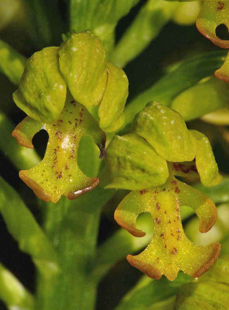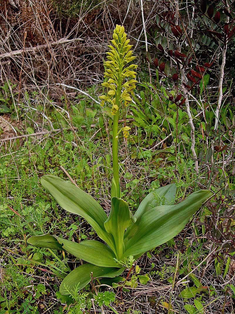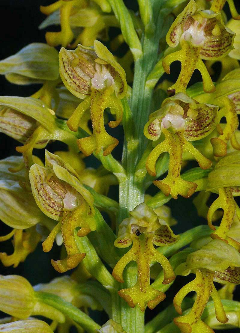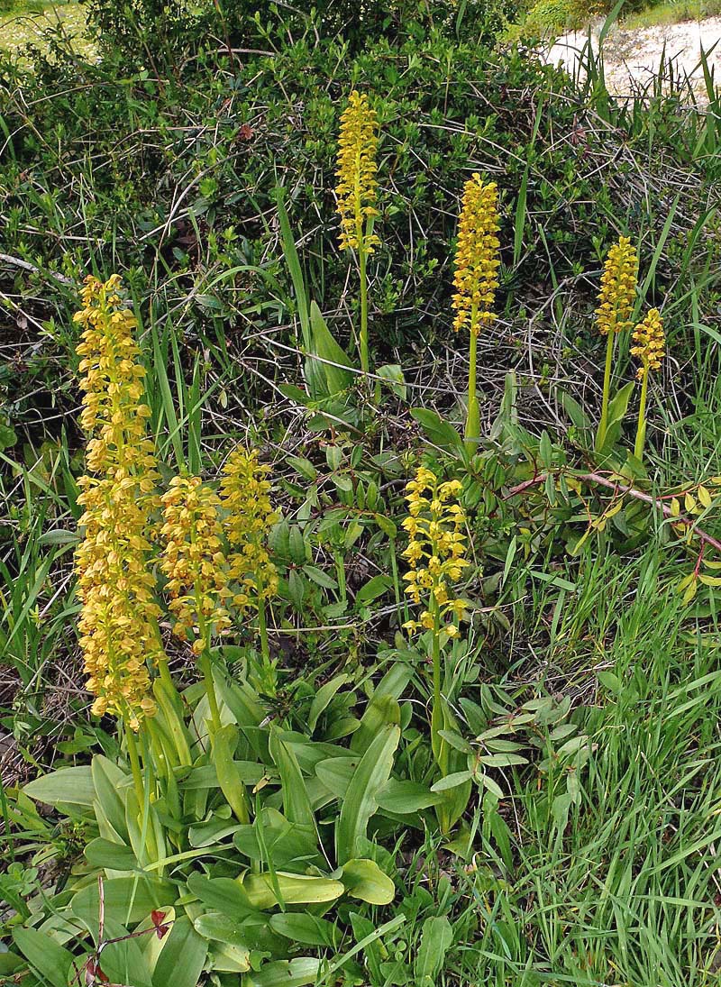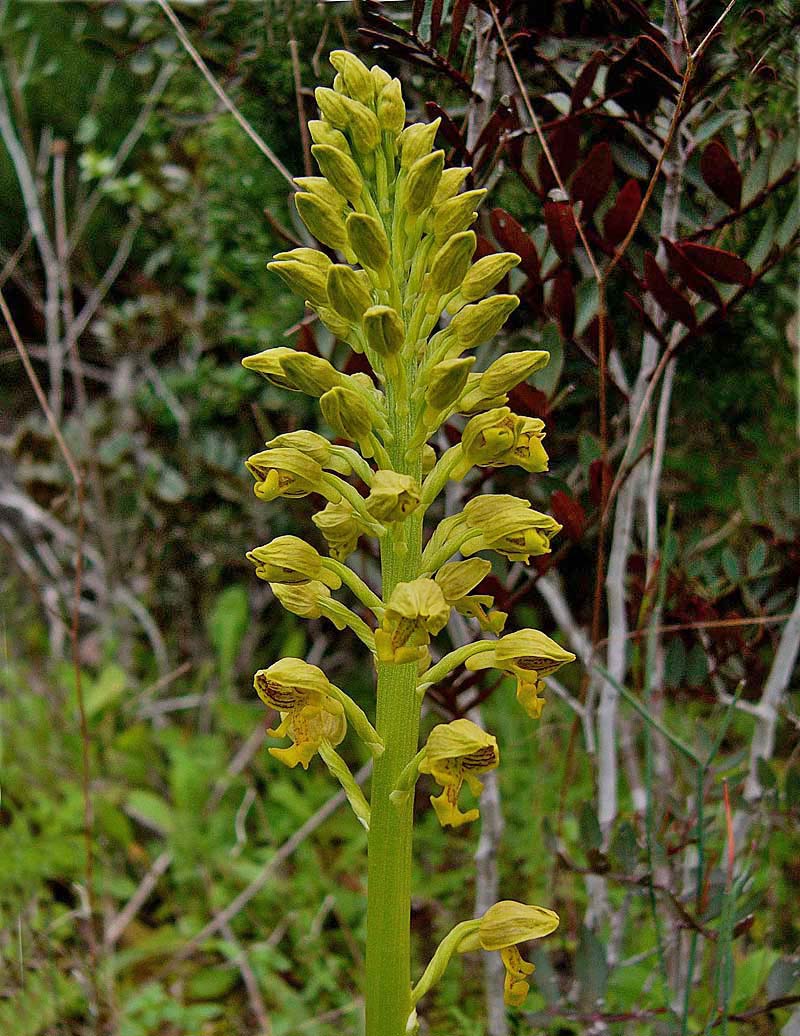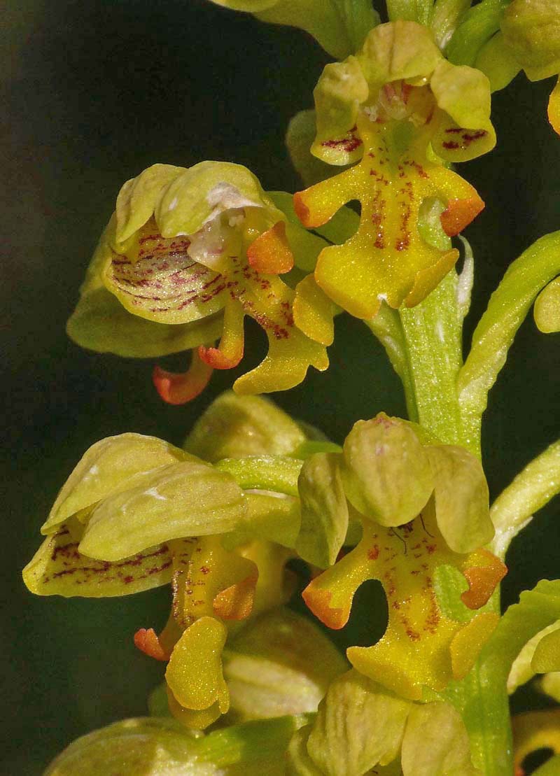 This species was first described from the Crimea (then Russia) in 1835 and is a member of the eleven strong O. militaris group whose name refers to the red spotting on the flowers. O. punctulata is undoubtedly one of Europes most impressive orchids and also one of its rarest with an eastern Mediterranean range from Greece in the west to Iran in the east. It is perhaps most familiar to Western European orchidologists as one of the specialties of the island of Cyprus where it seems destined to become still rarer due to habitat loss from apparently unrestricted tourist development. Its stronghold on the island is in the hills of the Akamas peninsula where with perseverance it is still quite possible to encounter the species without specialist site information. Its main sites seem to be reasonably well known and frequently visited in early March. This close attention doesn't however seem to be particularly detrimental but the already mentioned, threat from tourist development is far more challenging. The pictures accompanying this text are from a site containing some 50 plants but which was within just two hundred yards of coastal apartment complexes. The species is quite variable and most particularly in the flower colouration which can vary from an almost lime green to a much darker reddish, brown. The variant sepulchris from Anatolia has secondary lobes (arms and legs) that can be almost completely of this latter colouration. Photo 11 depicts a plant that although from Cyprus, seems to be some way down the evolutionary road towards variant status. O. punctulata is a beautiful and statuesque Orchis that can reach nearly 100 cms giving it a stature very much in the same league as some of the Himantoglossums . |