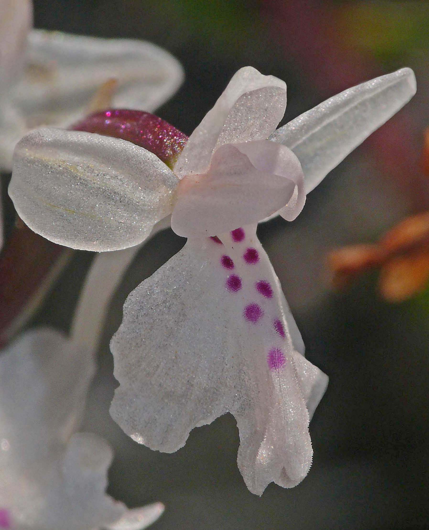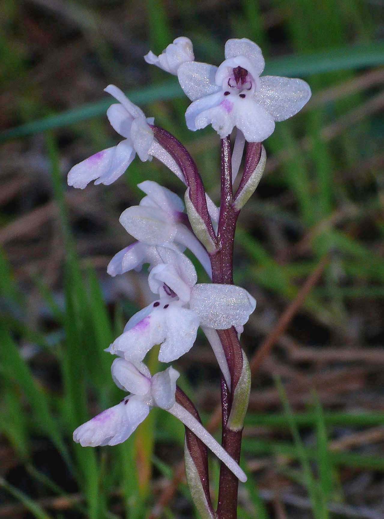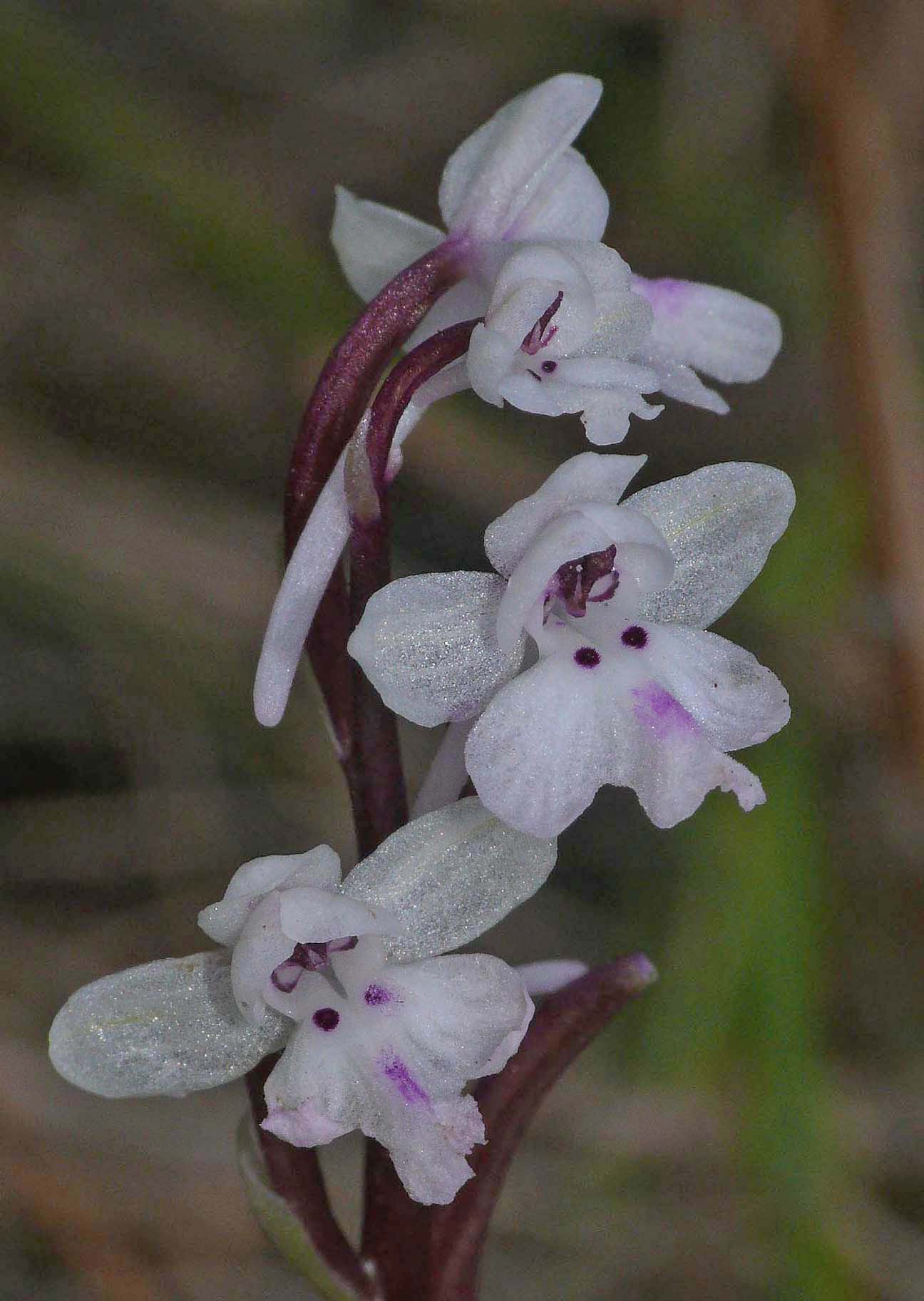 depending on the region in which it is found. The question at issue is whether or not these hybrids have sufficiently stabilized to be regarded as a species in their own right. The prevailing view seems to be that where O. sezikiana occurs, its parents are generally in close enough proximity to discount the possibility of the hybrid being seen as leading a truly independent existence. As has already been mentioned O. sezikiana is a heterogeneous taxon where the presence of four potential gene donors dictate the plants distribution. Its range is centred on Crete, Cyprus and Anatolia where it may be found growing (unsurprisingly) in similar habitat and aspect to that of O. quadripunctata. Given its hybrid background its appearance can be variable though it generally seems to possess more of the characteristics of O. quadripunctata. The main differences are usually to be found on the labellum where the central lip will contain more and heavier spotting, it may also show some different coloured blotching. The spur can be both straighter and heavier. The photos come from Cyprus where the plants are invariably white and Crete where plants may be white or pink. |