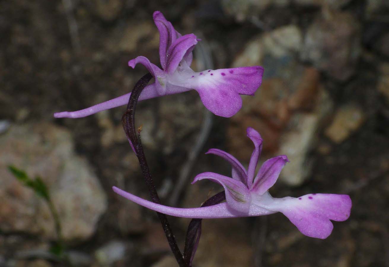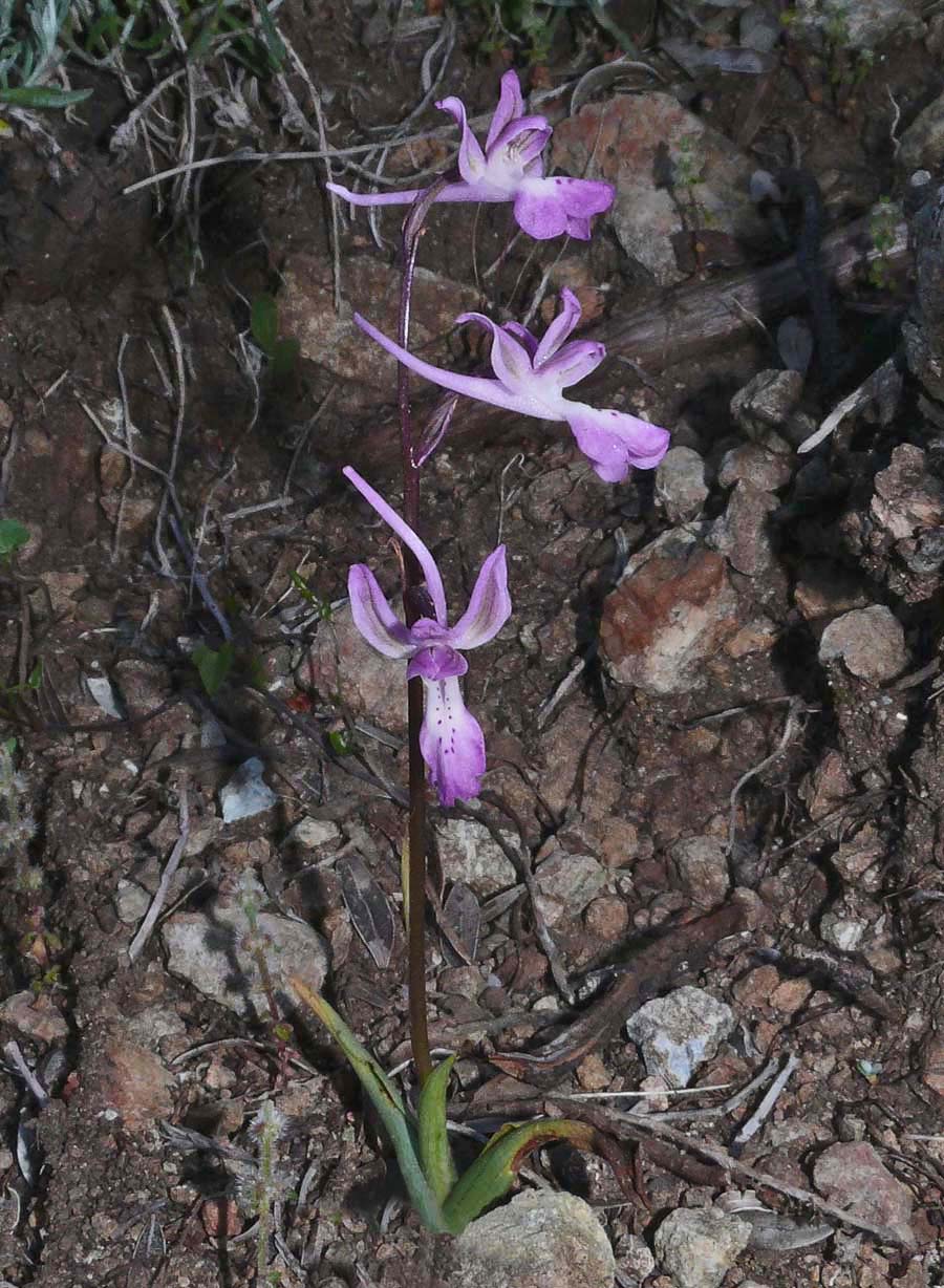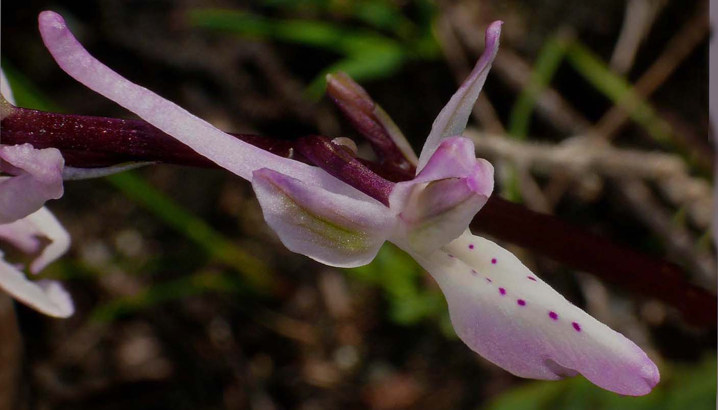 Its true status is a matter of debate amongst orchidologists and opinions vary widely as to whether O. troodi is a species in its own right or simply a variety of the similar O. anatolica. It cannot even be agreed yet that the two species are present on Cyprus with several acknowledged botanists believing that O. troodi is the only representative on the island. The reality of the situation has yet to be determined and we wait to see whether the splitters or the lumpers prevail ! For the purposes of this description however we will follow the Delforge view that O. troodi is a distinct species, endemic to Cyprus and that it grows there together with its relative, the very similar O. anatolica. This species is at its most frequent in the high Troodos mountains where it starts flowering in early April. At lower altitudes (where it is much rarer) it can be found as early as late February. The pictures are from the relatively low lying hills of the Akamas peninsula, dating from the first week of March. O. troodi may be separated from O. anatolica in two main ways. The first is habitat with the former species confined to the more mountainous parts of the island, primarily in the Troodos and higher areas of the Akamas peninsula (usually on more acidic substrates). The second difference is in size, with the former plant being a significantly more robust orchid, carrying larger and longer flowers in a generally looser inflorescence . An additional (though not certain) diagnostic feature is the colour of the flowers where O. troodi is usually a paler pink with more extensive white marking. |