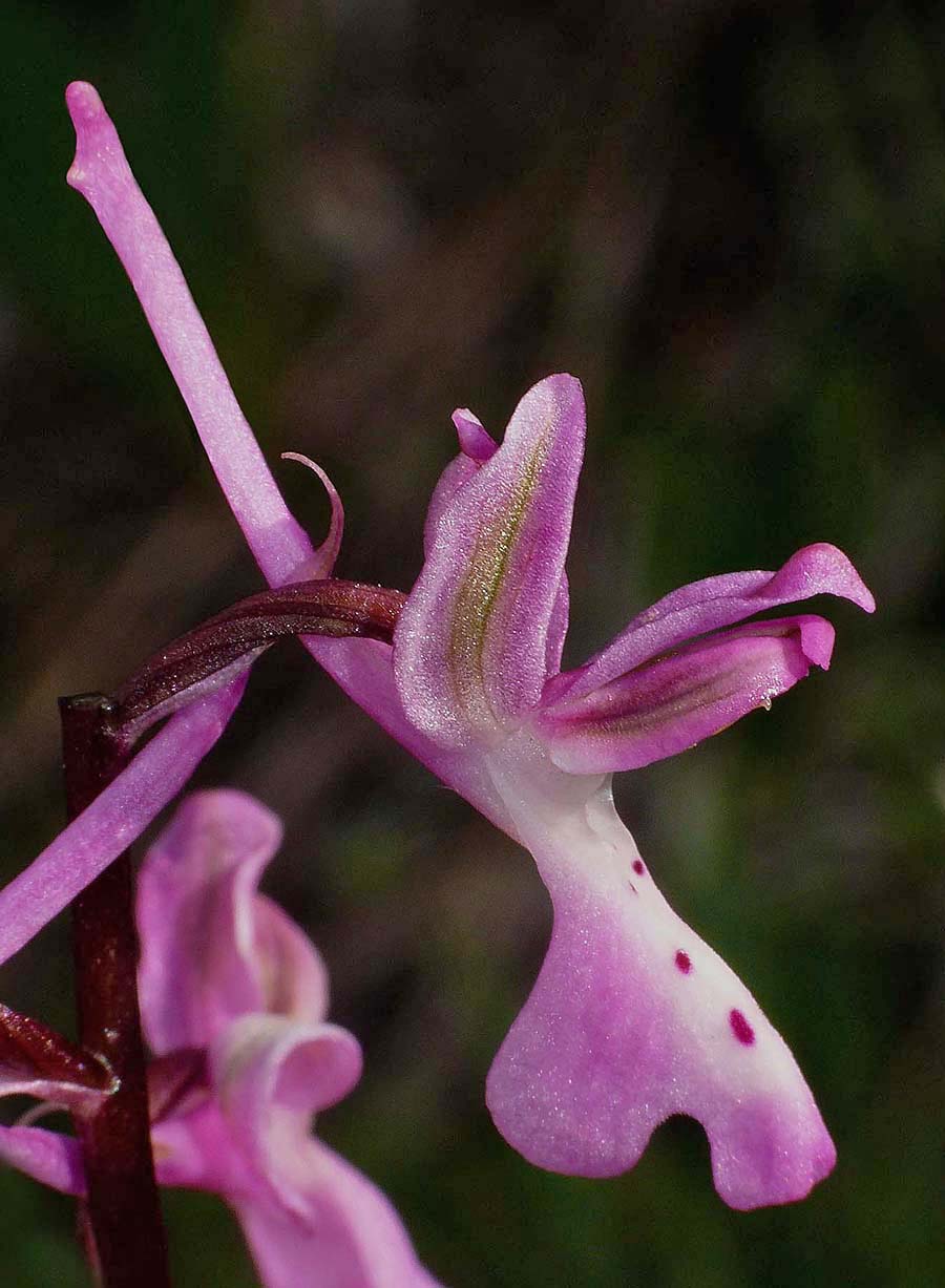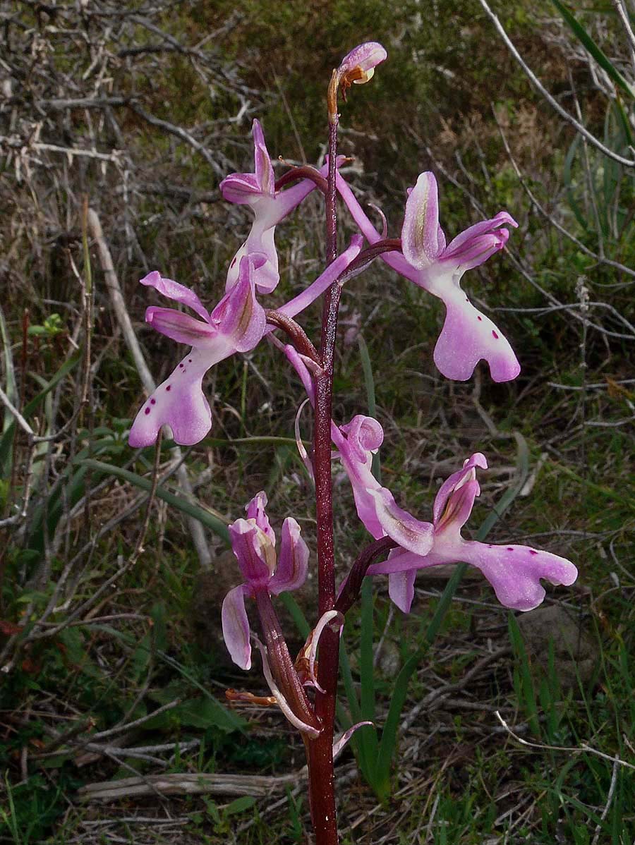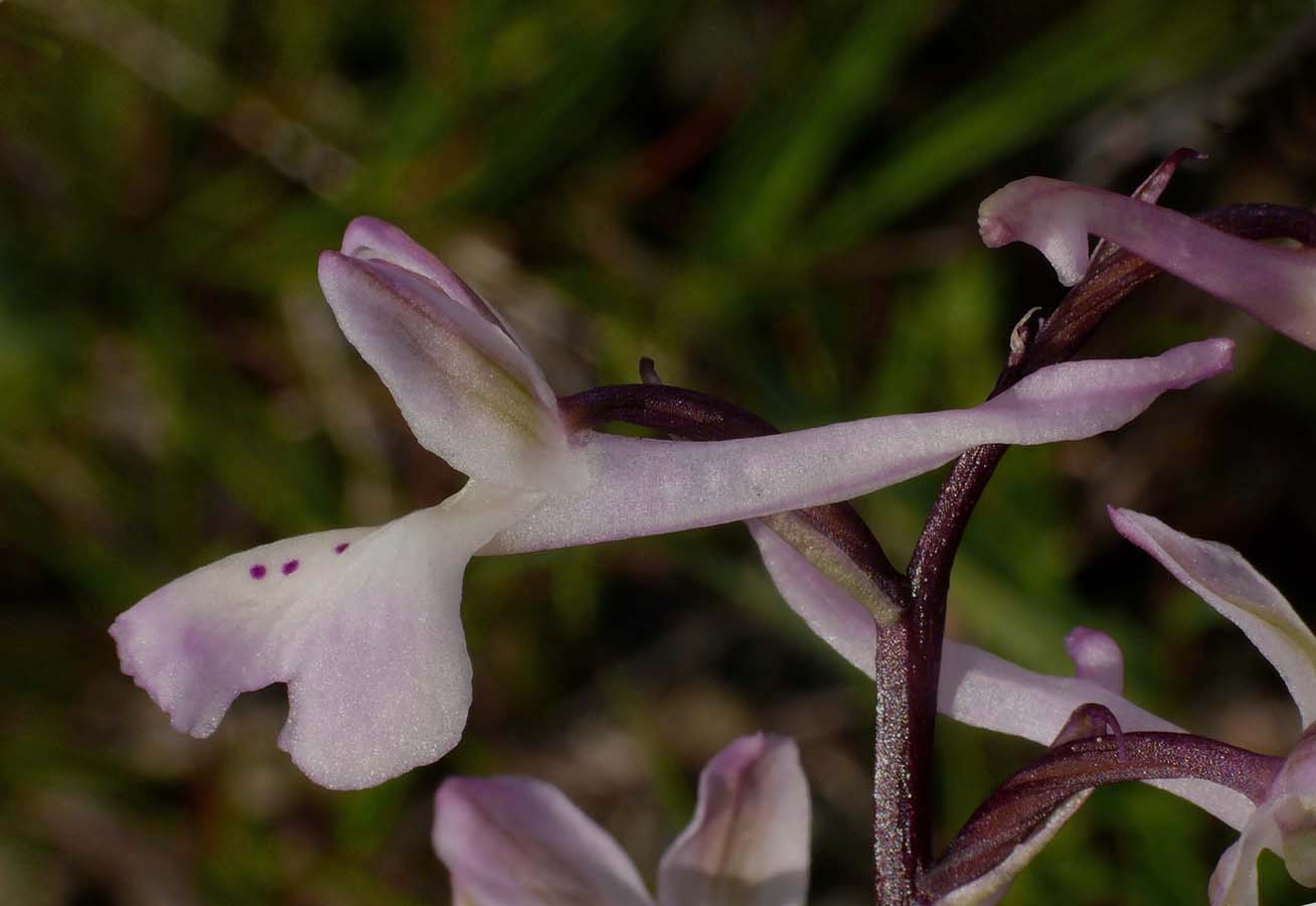 Its true status is a matter of debate amongst orchidologists and opinions vary widely as to whether O. troodi is a species in its own right or simply a variety of the similar O. anatolica. It cannot even be agreed yet that the two species are present on Cyprus with several acknowledged botanists believing that O. troodi is the only representative on the island. The reality of the situation has yet to be determined and we wait to see whether the splitters or the lumpers prevail ! For the purposes of this description however we will follow the Delforge view that O. troodi is a distinct species, endemic to Cyprus and that it grows there together with its relative, the very similar O. anatolica. This species is at its most frequent in the high Troodos mountains where it starts flowering in early April. At lower altitudes (where it is much rarer) it can be found as early as late February. The pictures are from the relatively low lying hills of the Akamas peninsula, dating from the first week of March. O. troodi may be separated from O. anatolica in two main ways. The first is habitat with the former species confined to the more mountainous parts of the island, primarily in the Troodos and higher areas of the Akamas peninsula (usually on more acidic substrates). The second difference is in size, with the former plant being a significantly more robust orchid, carrying larger and longer flowers in a generally looser inflorescence . An additional (though not certain) diagnostic feature is the colour of the flowers where O. troodi is usually a paler pink with more extensive white marking. |