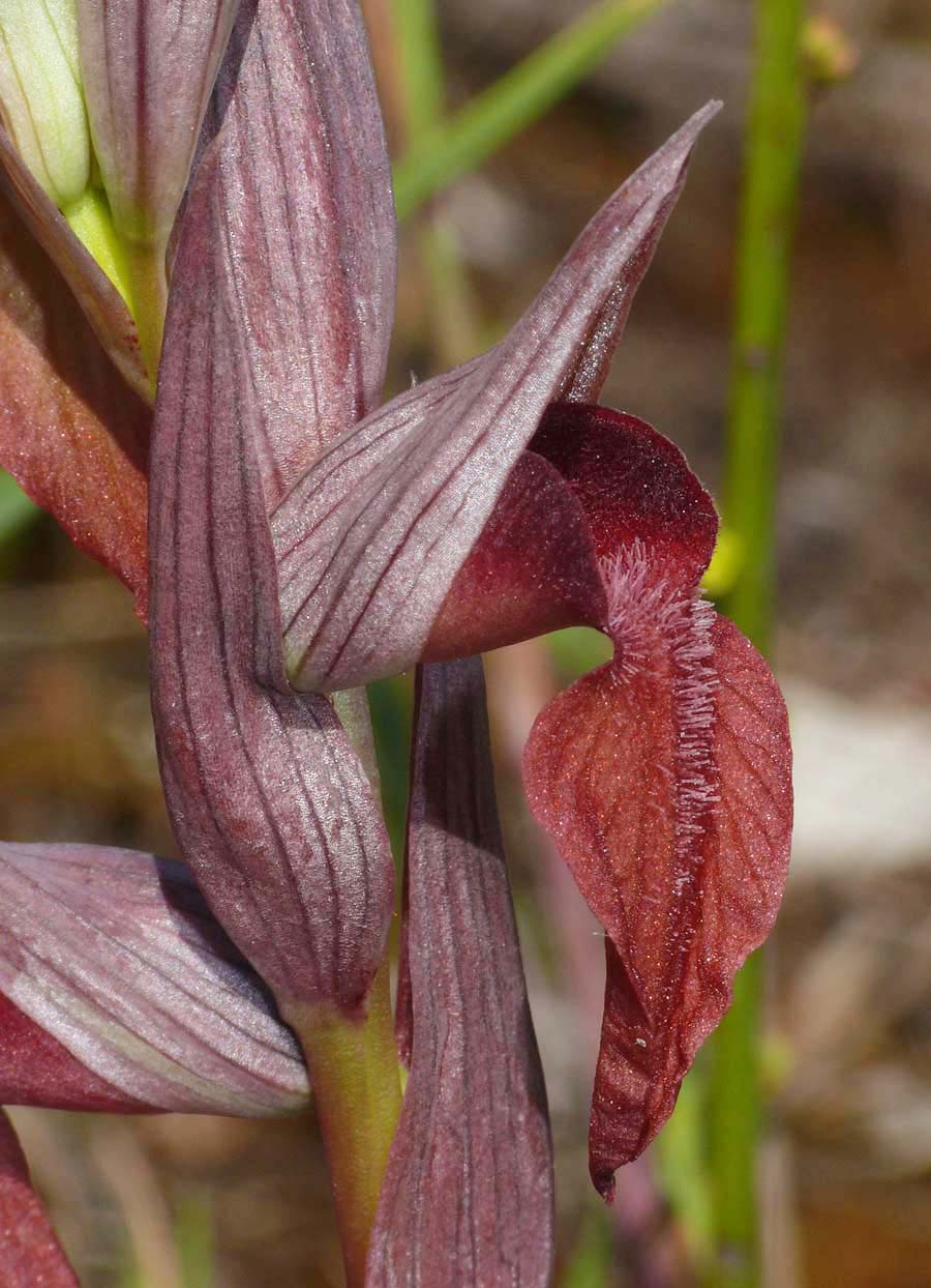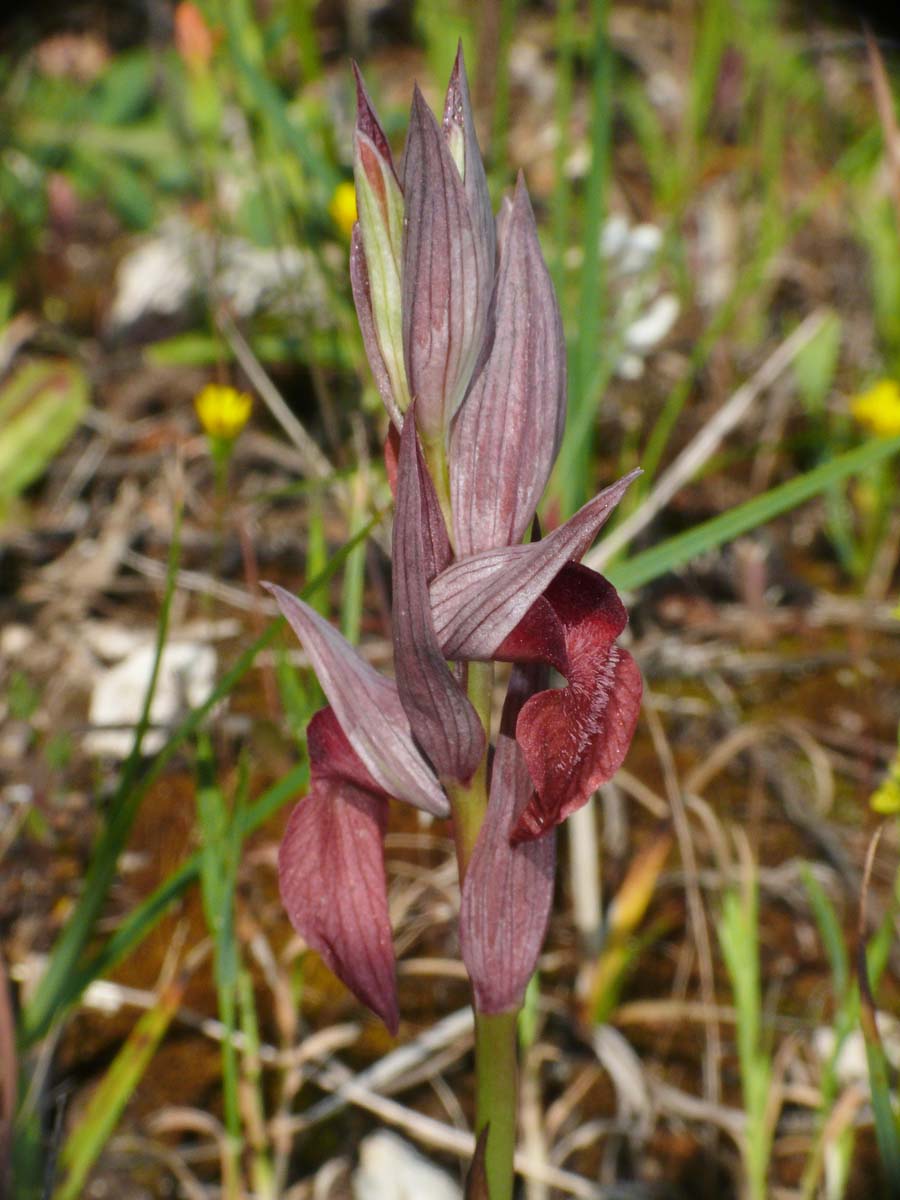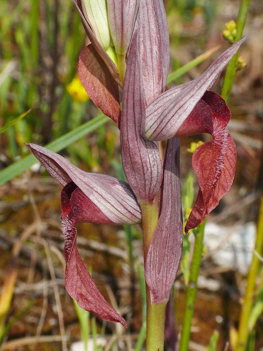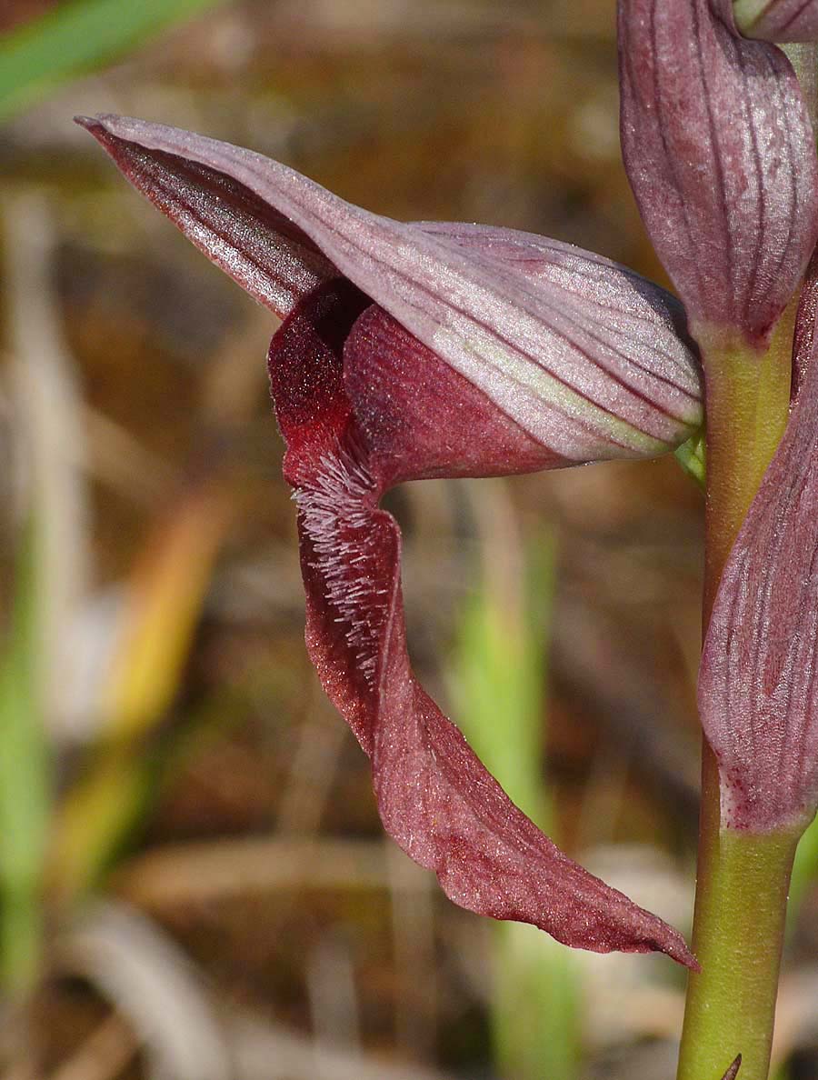 S. guadinae was first described from Lecce by Lumare, Medagli and Biagioli in 2017 and is named after the ancient town of Guadina, now Aquatina di Frigole in the province of Lecce. This orchid is of hybridogenous origin with S. cordigera and S. longipetala its progenitors. It may occur as a casual hybrid wherever the range of the two taxons converge but in the Salento peninsula, hybridization and successive introgression has given rise to a population of plants with stabilized reproduction, independent of the original parent species. At present it is best known from the coastal areas to the east of Lecce where it was closely studied, described and formally designated a species. The area of southern Italy from which S. gaudinae hails is one in which Serapias species are many and varied, so it's perhaps not a great surprise that hybridization is commonplace and further that several of these crosses have evolved into stabilized communities. Separating S. lucana, S. gaudinae and S. sallentina (all hybridogenous species from Salento) is not easy and despite stabilized reproduction having eventuated, they still exhibit sufficient variation to create problems with identification. The fact that S. cordigera is one of the gene contributors to all these hybrids is inconvenient and in reality, only careful scientific analysis can really distinguish them. S. gaudinae is a smallish plant but with 4 to 8 large flowers held alternately up the short inflorescence. A key distinguishing feature is the stem which is invariably yellowy green with a varying degrees of red staining around the leaf axils. Bracts are usually shorter or equal in length to the hood. The pictures are from an area just to the north of San Cataldo near Lecce, dating from the 9th of May. |