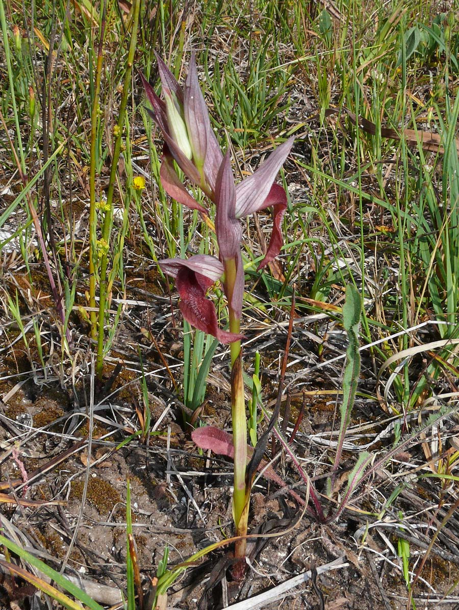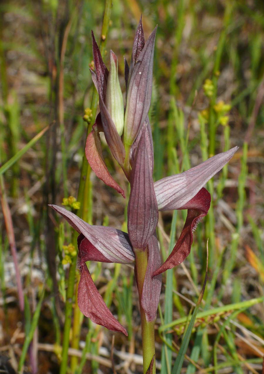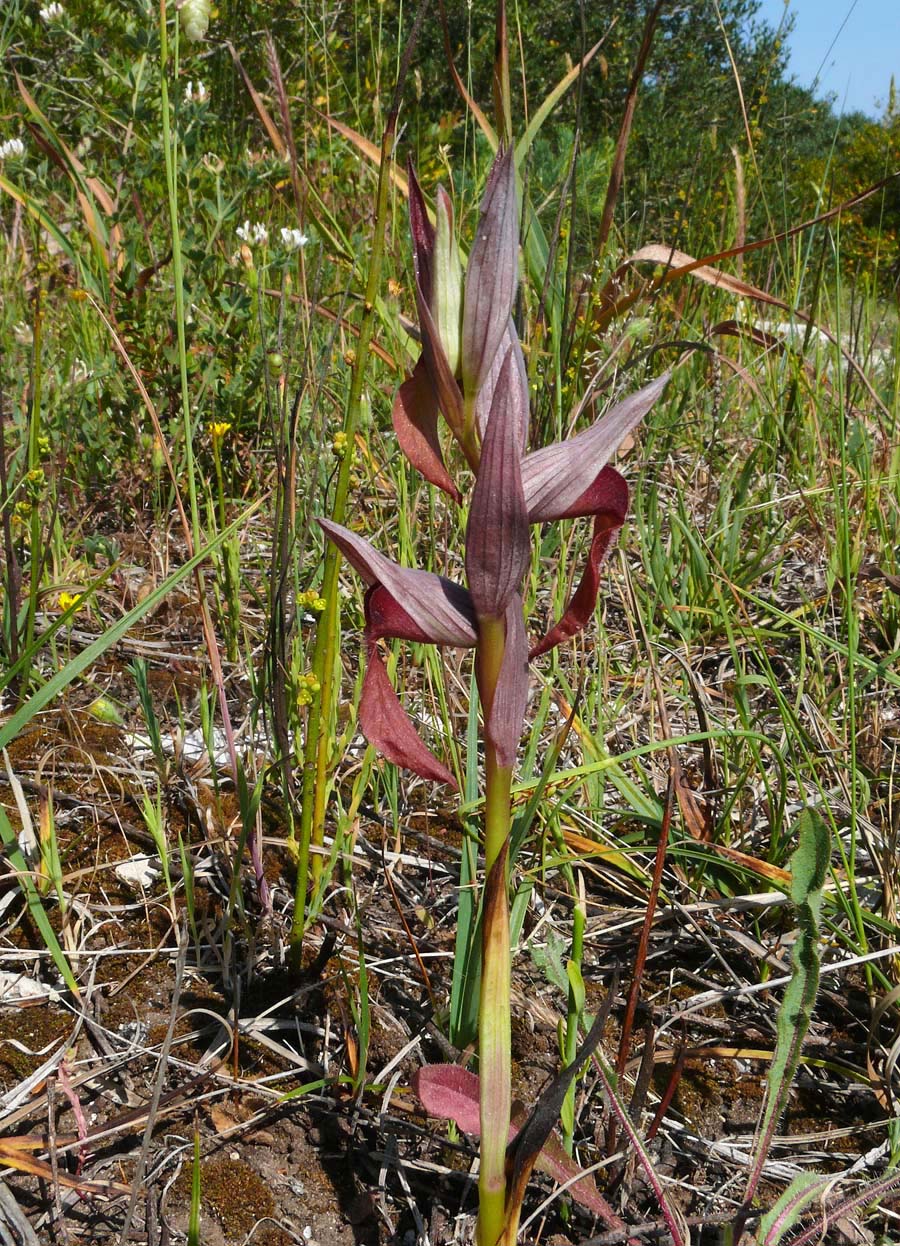 S. guadinae was first described from Lecce by Lumare, Medagli and Biagioli in 2017 and is named after the ancient town of Guadina, now Aquatina di Frigole in the province of Lecce. This orchid is of hybridogenous origin with S. cordigera and S. longipetala its progenitors. It may occur as a casual hybrid wherever the range of the two taxons converge but in the Salento peninsula, hybridization and successive introgression has given rise to a population of plants with stabilized reproduction, independent of the original parent species. At present it is best known from the coastal areas to the east of Lecce where it was closely studied, described and formally designated a species. The area of southern Italy from which S. gaudinae hails is one in which Serapias species are many and varied, so it's perhaps not a great surprise that hybridization is commonplace and further that several of these crosses have evolved into stabilized communities. Separating S. lucana, S. gaudinae and S. sallentina (all hybridogenous species from Salento) is not easy and despite stabilized reproduction having eventuated, they still exhibit sufficient variation to create problems with identification. The fact that S. cordigera is one of the gene contributors to all these hybrids is inconvenient and in reality, only careful scientific analysis can really distinguish them. S. gaudinae is a smallish plant but with 4 to 8 large flowers held alternately up the short inflorescence. A key distinguishing feature is the stem which is invariably yellowy green with a varying degrees of red staining around the leaf axils. Bracts are usually shorter or equal in length to the hood. The pictures are from an area just to the north of San Cataldo near Lecce, dating from the 9th of May. |