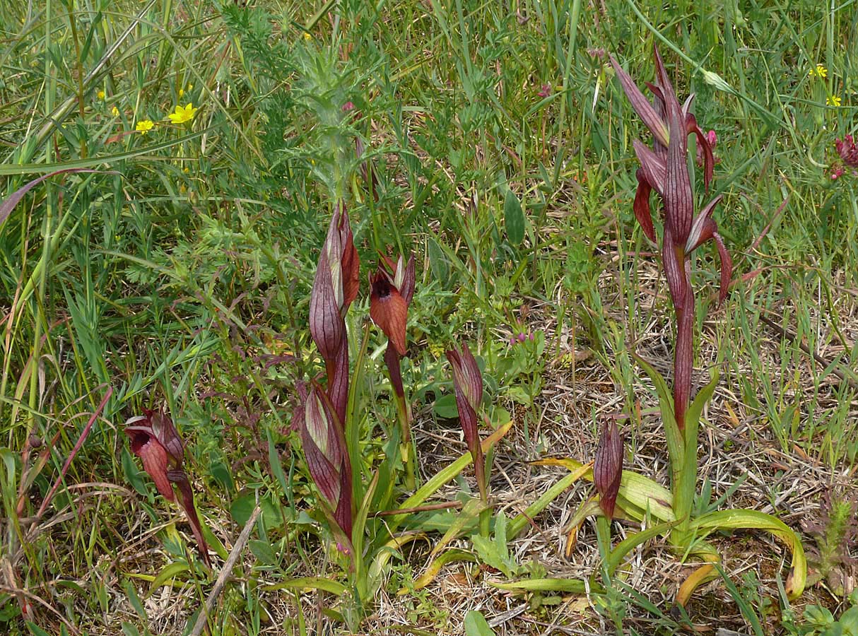 This species was first described by M. L. Perko in 1998 from Istria, Croatia and is a member of the large S. vomeracea group of Serapias, having originally been classified as S. vomeracea ssp istriaca . S. istriaca is endemic to the southern tip of the Istrian peninsula where it is a reasonably common species and often found growing alongside fellow group member S. cordigera. Its similarity to this species is apparent but in pure populations it presents characteristics that will readily distinguish it. Its colouration is the first and most obvious feature as it tends to be markedly lighter in shade than S. cordigera , in which both the epichile and hypochile are normally dark crimson to deep coffee in colour. S. istriaca does not seem to demonstrate any significant colour variation, typically being just lighter or darker shades of the ubiquitous Serapias brick red. The plant itself is however variable and being of probable hybridogenous origin, can differ in both size and form from one population to another. Bracts are normally either longer or the same length as the hood but when attempting to differentiate from S. cordigera, the most important diagnostic feature is the lateral lobes of the hypochile, which unlike the latter species, barely project beyond the hood. The epichile although both extended and broad, is not prominently heart shaped. As has already been mentioned, S. istriaca has an extremely limited range in the southern most region of Istria and particularly within the the Premantura Naional Park where it can be found without great difficulty, growing in calcareous grassland and coastal garrigue. The photographs are from the park and date from early May, at which time the flowers were only just beginning to appear. |