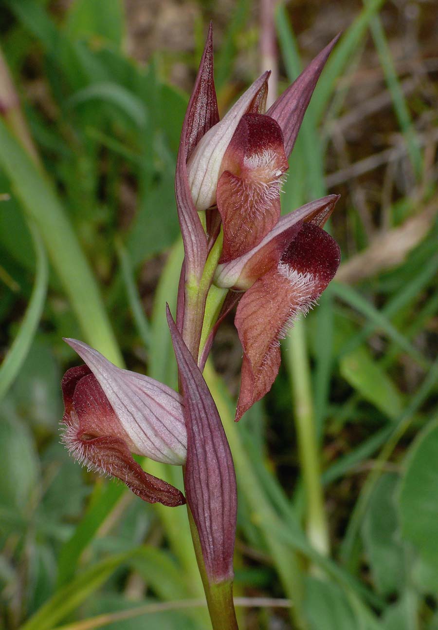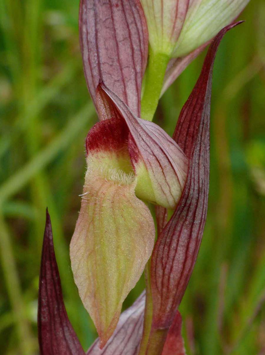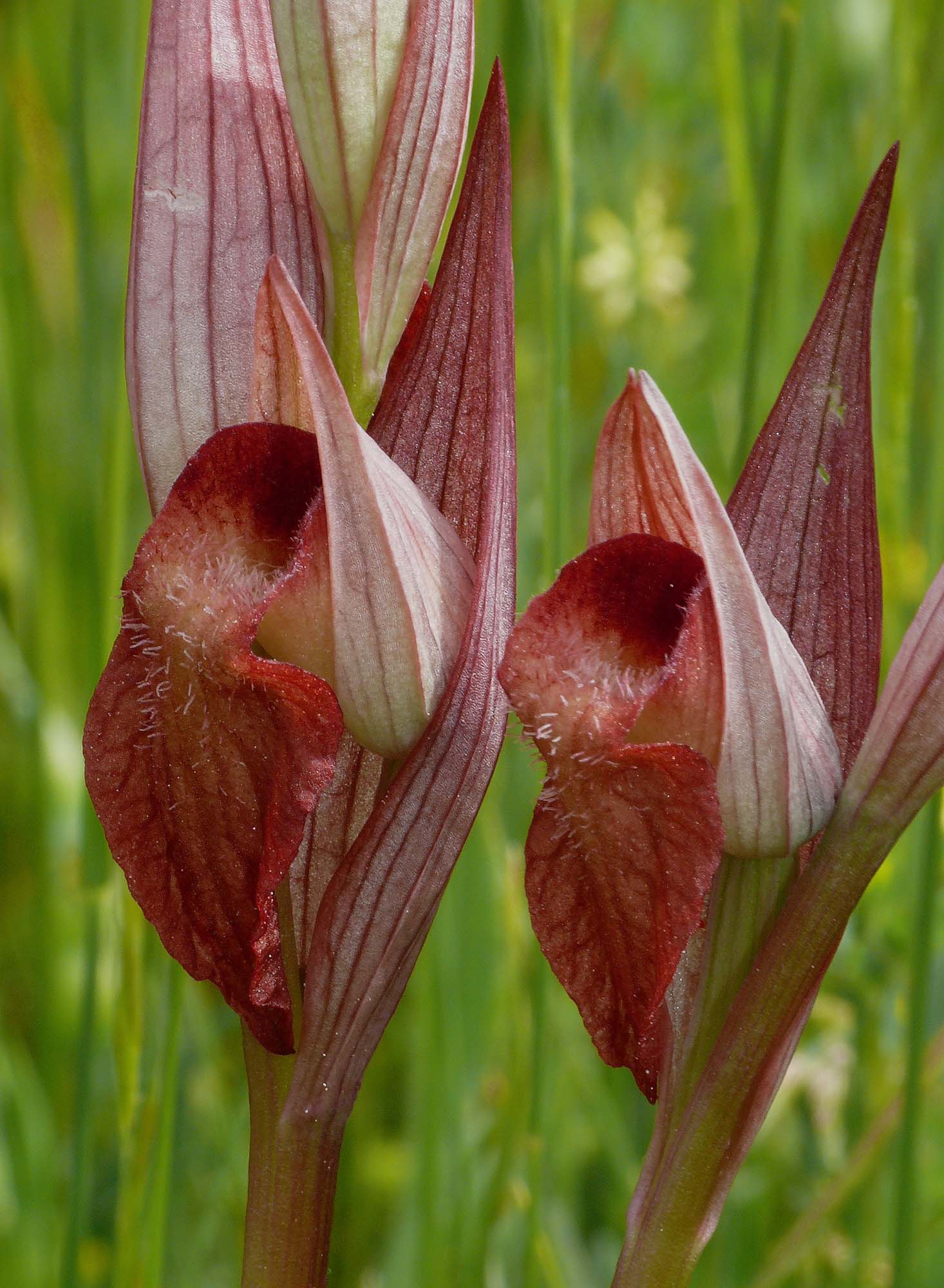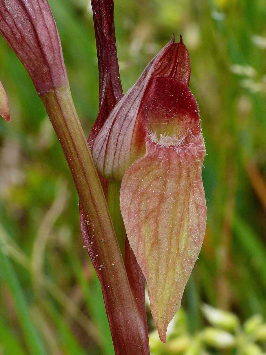 S. joaninae is only known from a few, mostly coastal and a small number of inland locations in southern France, exclusively on alkaline soils, where it is local and not uncommon. Its preferred habitat is open grassland, macchia, wasteland and forest margins but rarely in shaded positions or rank vegetation. The flower itself is reminiscent of S. vomeracea but the inflorescence contains just a few flowers sequenced loosely up the stem, quite unlike the denser flower-head of its cousin. The number of flowers is usually three or four but may rarely be up to six and carried on an elongated stem which can occasionally contribute to an overall height reaching a statuesque 60cms. The epichile, not unlike S. vomeracea, is wide and relatively long but rarely appears in the usual Serapias brick red, being generally lighter coloured and delicately tinted with hues of yellow or orange. The bracts always exceed the length of the hood and as with the hood, are darker and more typically mauveish/red in colour than the epichile. The pictures come from the Hyeres region of Var in southern France and date from the last week of May at which time they were in full flower. |