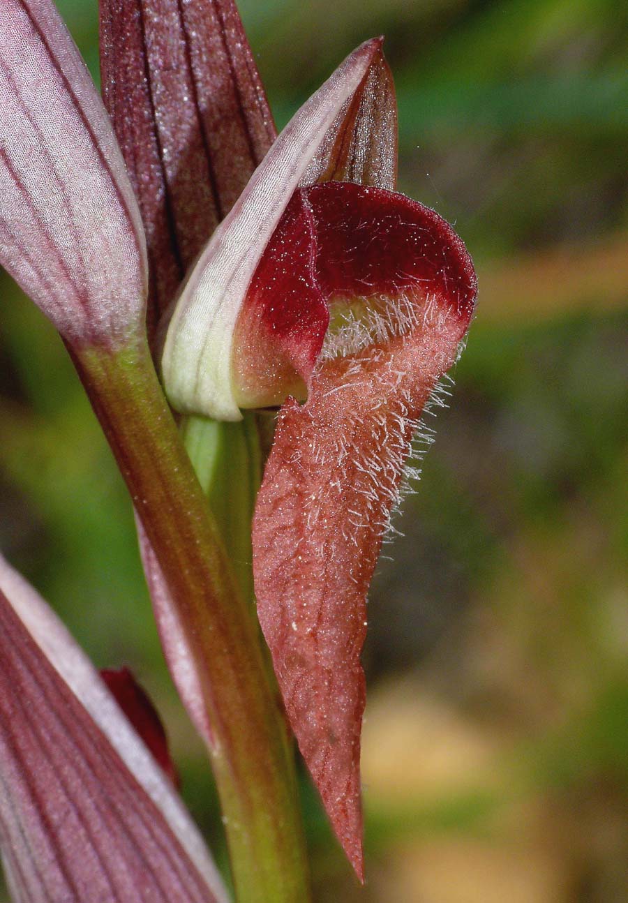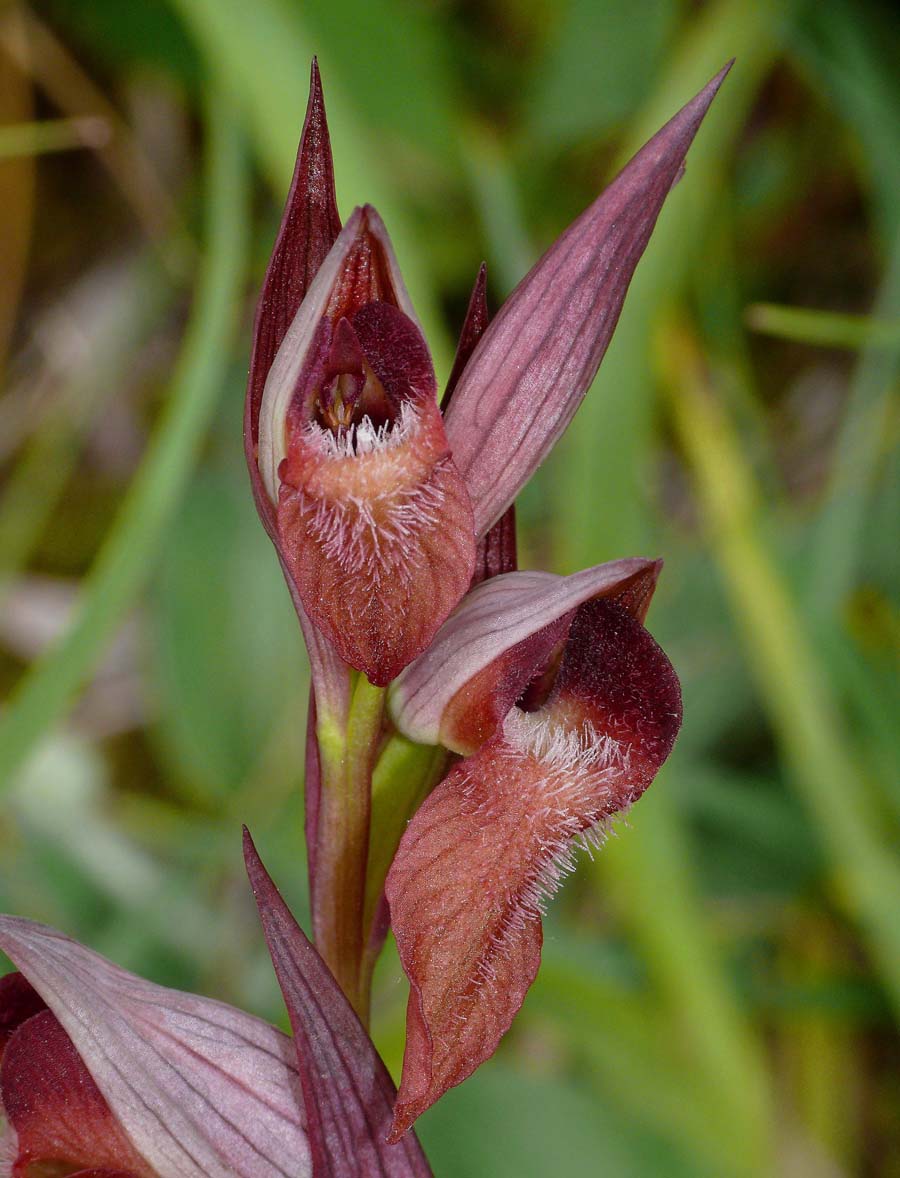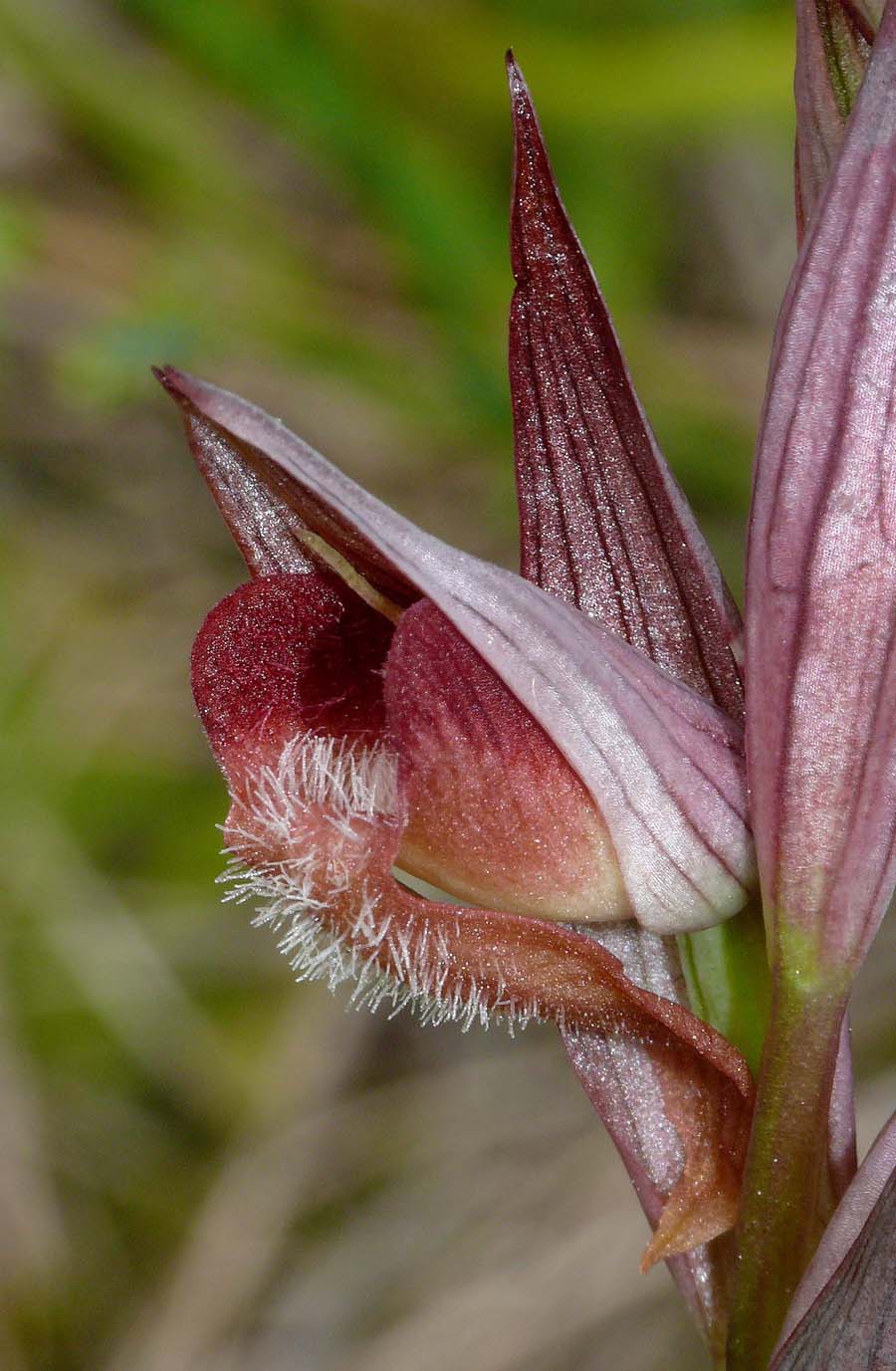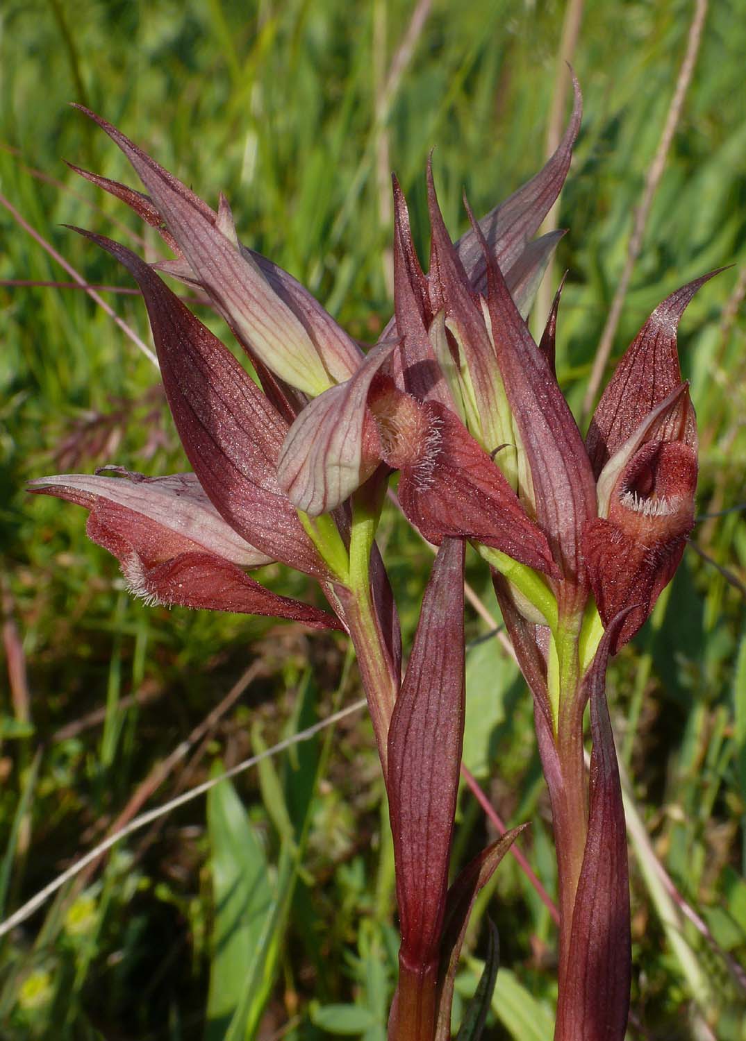 S. joaninae is only known from a few, mostly coastal and a small number of inland locations in southern France, exclusively on alkaline soils, where it is local and not uncommon. Its preferred habitat is open grassland, macchia, wasteland and forest margins but rarely in shaded positions or rank vegetation. The flower itself is reminiscent of S. vomeracea but the inflorescence contains just a few flowers sequenced loosely up the stem, quite unlike the denser flower-head of its cousin. The number of flowers is usually three or four but may rarely be up to six and carried on an elongated stem which can occasionally contribute to an overall height reaching a statuesque 60cms. The epichile, not unlike S. vomeracea, is wide and relatively long but rarely appears in the usual Serapias brick red, being generally lighter coloured and delicately tinted with hues of yellow or orange. The bracts always exceed the length of the hood and as with the hood, are darker and more typically mauveish/red in colour than the epichile. The pictures come from the Hyeres region of Var in southern France and date from the last week of May at which time they were in full flower. |