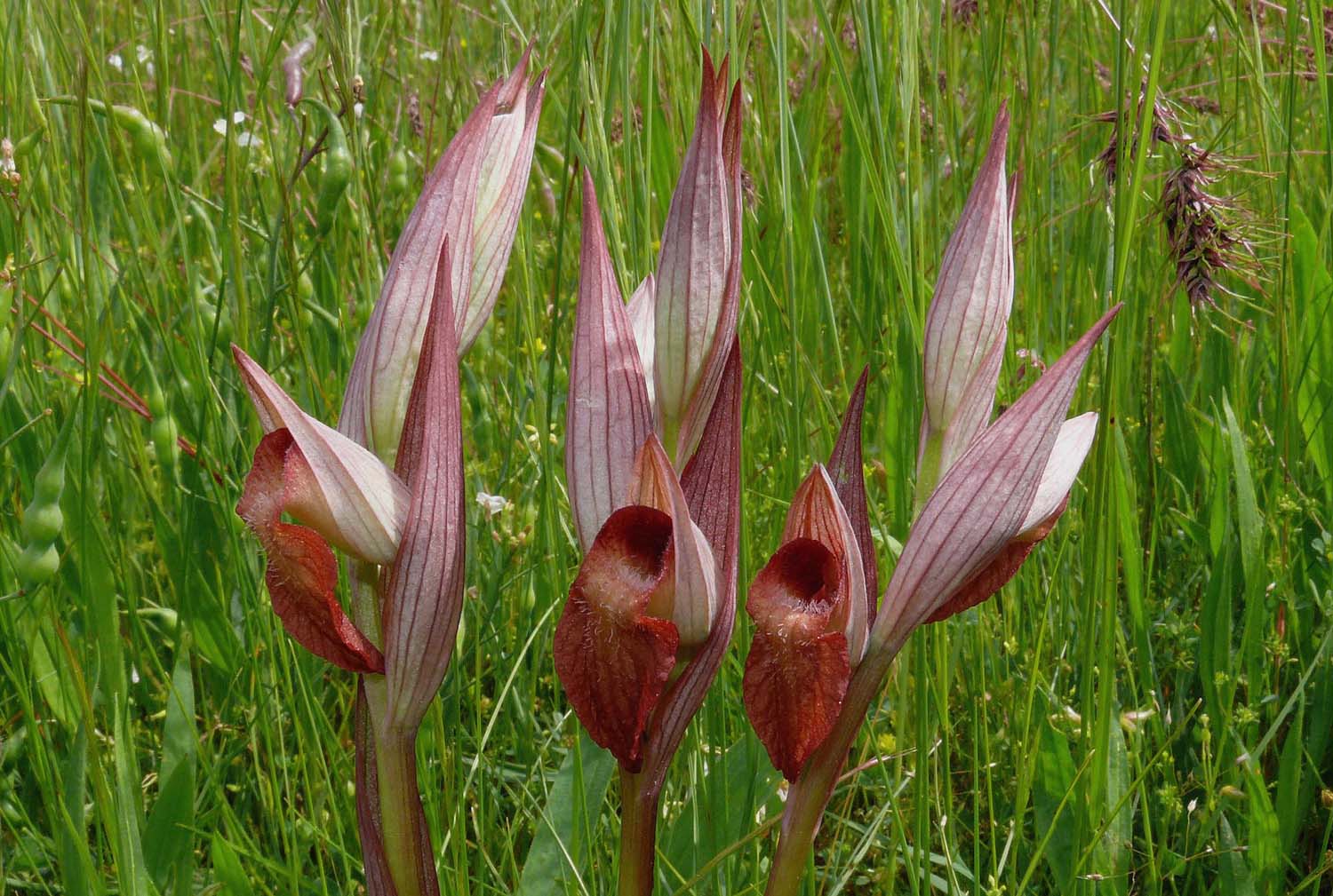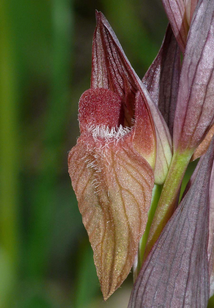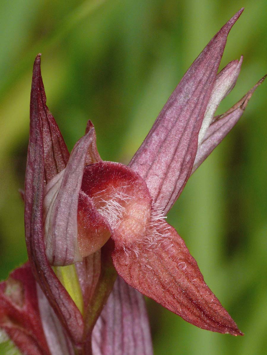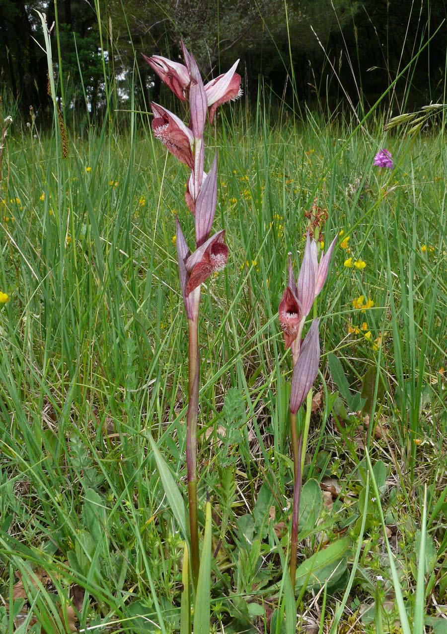 S. joaninae is only known from a few, mostly coastal and a small number of inland locations in southern France, exclusively on alkaline soils, where it is local and not uncommon. Its preferred habitat is open grassland, macchia, wasteland and forest margins but rarely in shaded positions or rank vegetation. The flower itself is reminiscent of S. vomeracea but the inflorescence contains just a few flowers sequenced loosely up the stem, quite unlike the denser flower-head of its cousin. The number of flowers is usually three or four but may rarely be up to six and carried on an elongated stem which can occasionally contribute to an overall height reaching a statuesque 60cms. The epichile, not unlike S. vomeracea, is wide and relatively long but rarely appears in the usual Serapias brick red, being generally lighter coloured and delicately tinted with hues of yellow or orange. The bracts always exceed the length of the hood and as with the hood, are darker and more typically mauveish/red in colour than the epichile. The pictures come from the Hyeres region of Var in southern France and date from the last week of May at which time they were in full flower. |