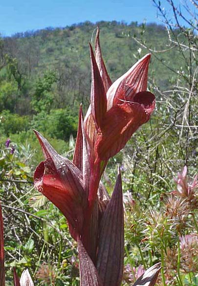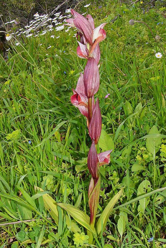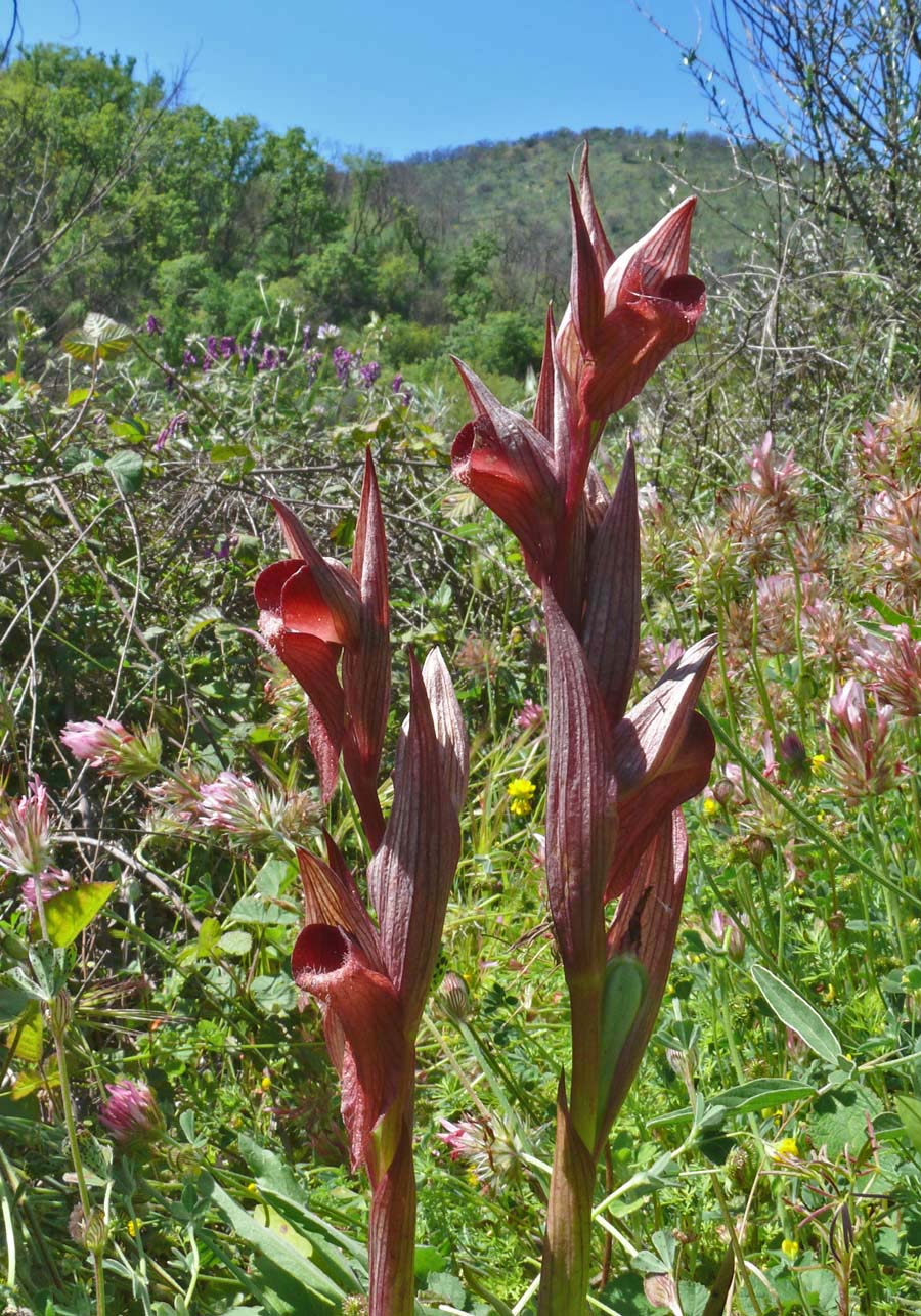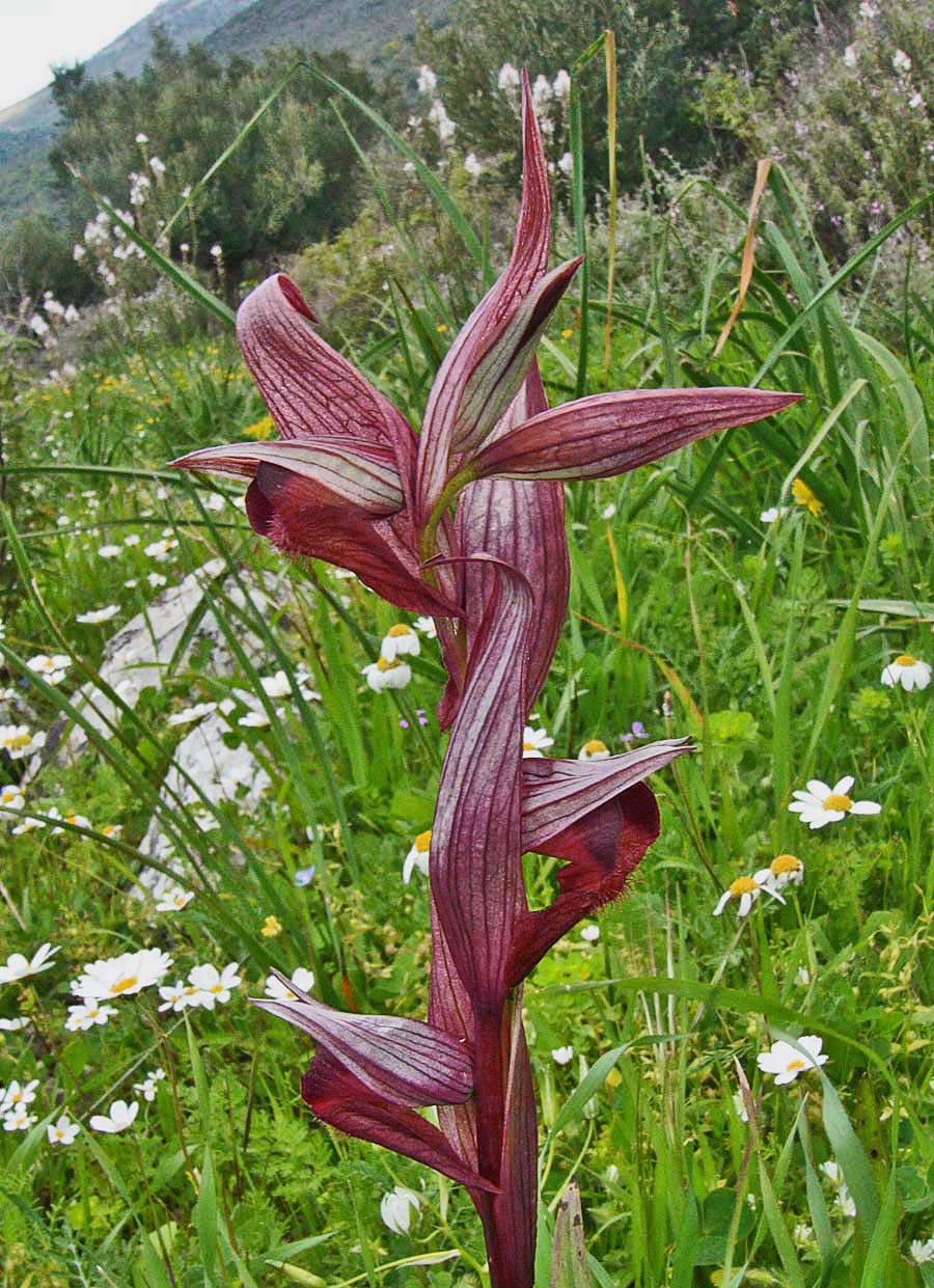 S. moreana was first described from the Peloponnese by Baumann and Lorenz in 2005 and is named after Morea, the medieval name for the Peloponnese. It is a member of the S. orientalis group of Serapias. Its distribution is restricted to the Peloponnese, Kythera and the Ionian islands of Cephalonia and Zakynthos. It is suspected to have a wider range but this has yet to be confirmed. S. moreana is not a particularly rare species which until recently had gone unrecognized due to its similarity to S. orientalis. It is however a usually more robust plant, taller, with a longer inflorescence and broader clasping leaves, The flowers themselves exhibit a significantly long epichile and are almost always reddish brown unlike S. orientalis which frequently produces lighter colour morphs. Flowers can number from 3 to 10 with bracts that are either equal in length or exceed the hood. This is an orchid of dry grassy meadows, wasteland, phrygana and abandoned terraces on predominately alkaline soils. S. moreana is usually a large species but smaller, less robust plants can be found, though the broader leaves and long epichile are always a consistent distinguishing feature. Overall the species is naturally quite variable and as always with members of the Serapias genus, hybridization can create identification problems. It is a relatively early flowerer first appearing in mid March and in its prime at the beginning of April. The photographs come from the Peloponnese, dating from the middle of April at which time they were in full flower. |
