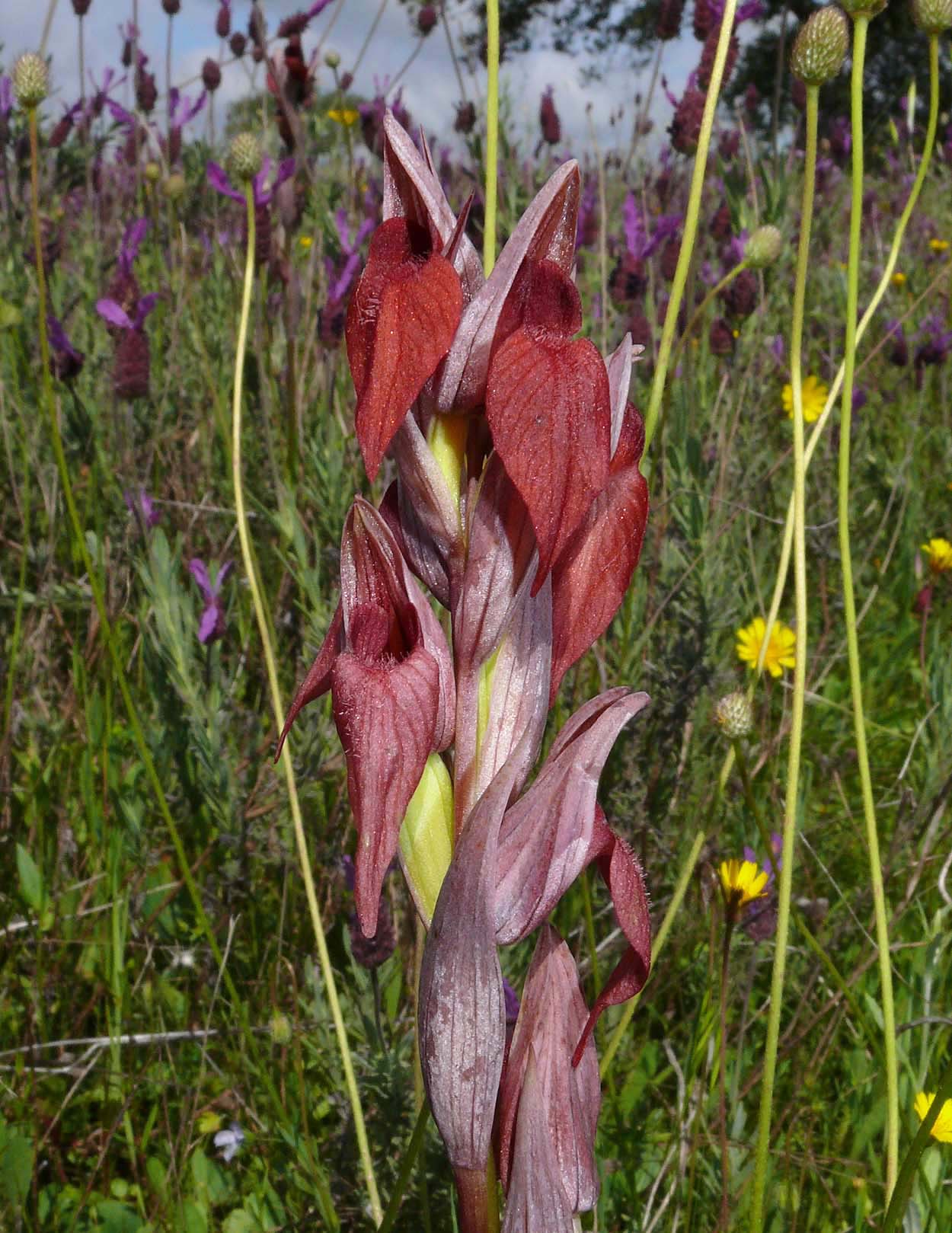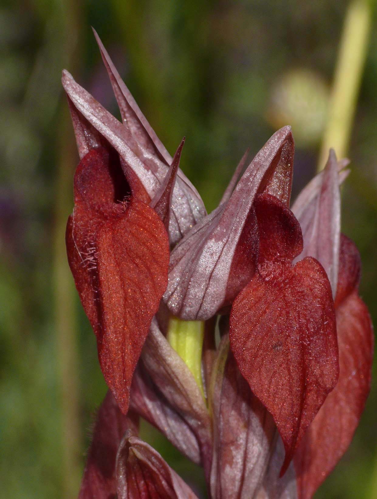 The hybrid pictured here is a cross between the newly described S. occidentalis and S. cordigera and comes from Dehesa de Moheda Alta, a nature reserve in the Extremadura of western Spain. This particular area is one in which Serapias species dominate to the virtual exclusion of any other genus and no less than seven full species were present in a relatively small area. Intermediates were common and determining the lineage of some of them was almost impossible. In the case of this hybrid, proximity to the parents and the plants readily recognizable characteristics made its origins reasonably apparent. Nonetheless identification could not be made with complete certainty and it's entirely possible that other species may also have provided genetic input. The photographs date from the 22nd of April. |