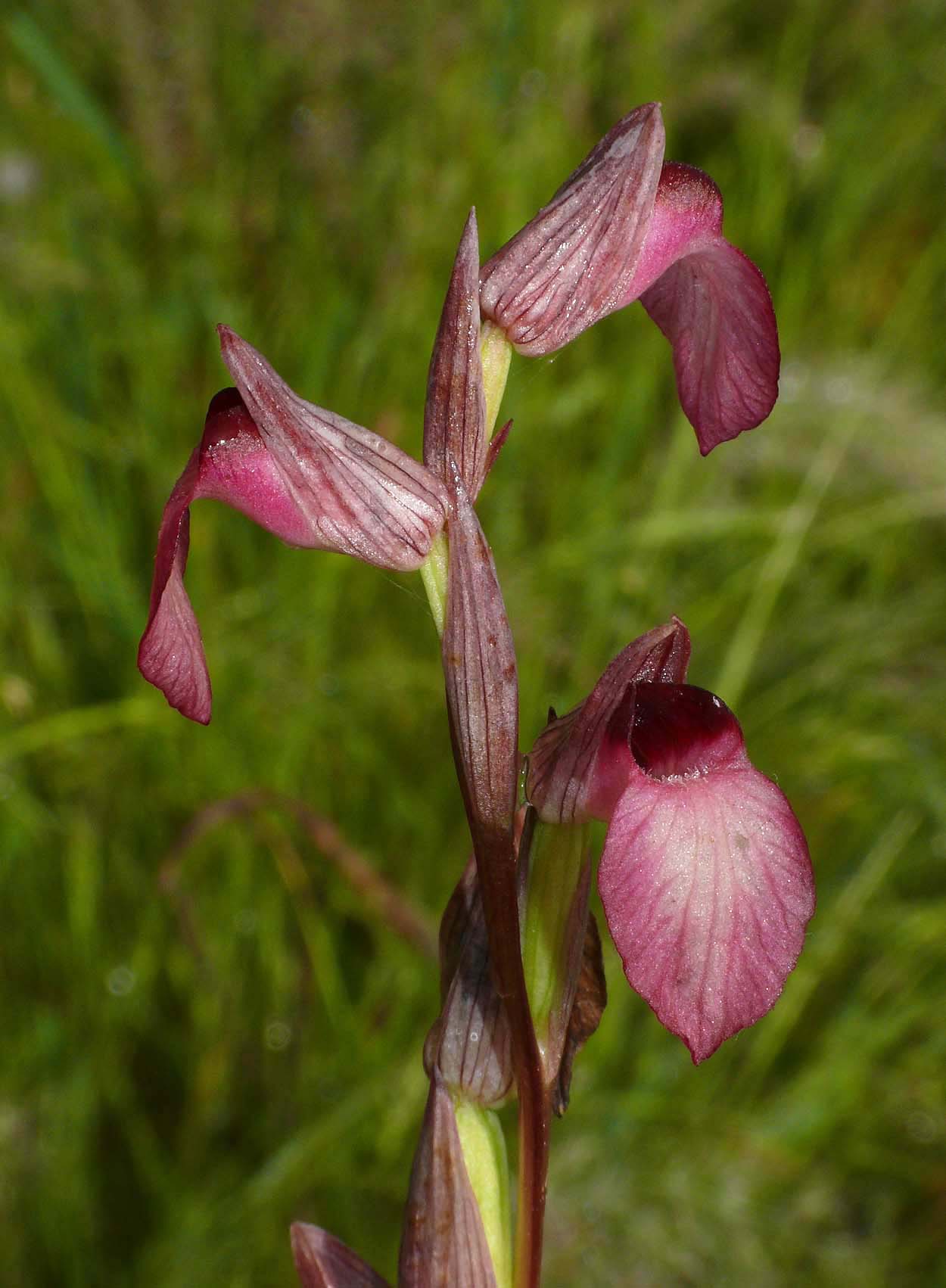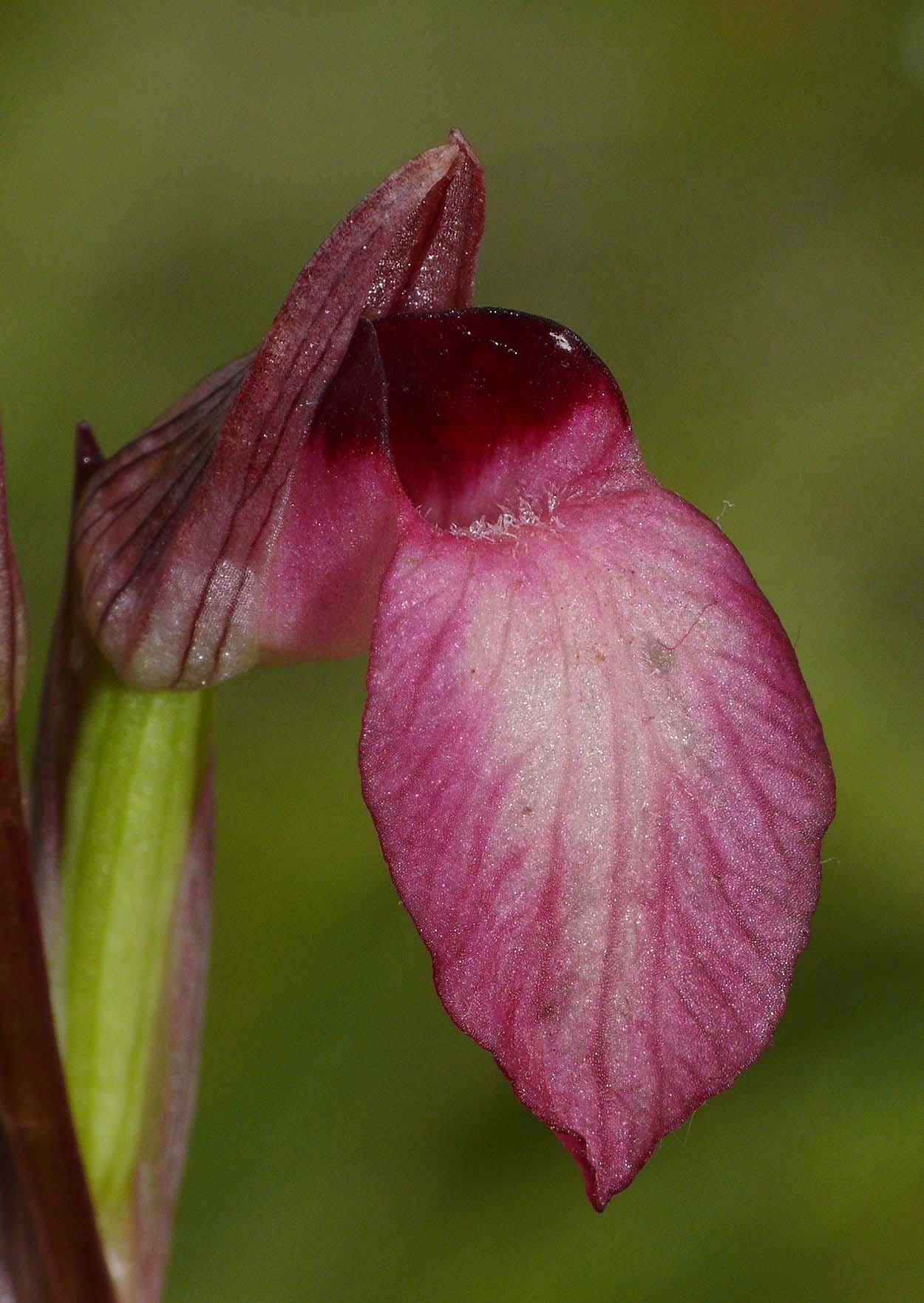 The hybrid pictured here is a cross between the newly described S. occidentalis and S. lingua and comes from Dehesa de Moheda Alta, a nature reserve in the Extremadura of western Spain. This particular area is one in which Serapias species dominate to the virtual exclusion of any other genus and no less than seven full species were present in a relatively small area. Intermediates were common and determining the lineage of some of them was almost impossible. In the case of this hybrid, proximity to the parents and the plants readily recognizable characteristics made it's origins reasonably apparent. Nonetheless identification could not be made with certainty and it's entirely possible that other species may have provided genetic input. The photographs date from the 22nd of April. |