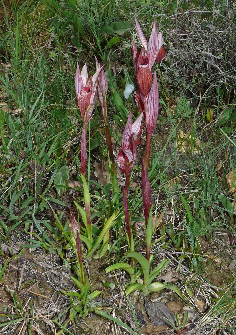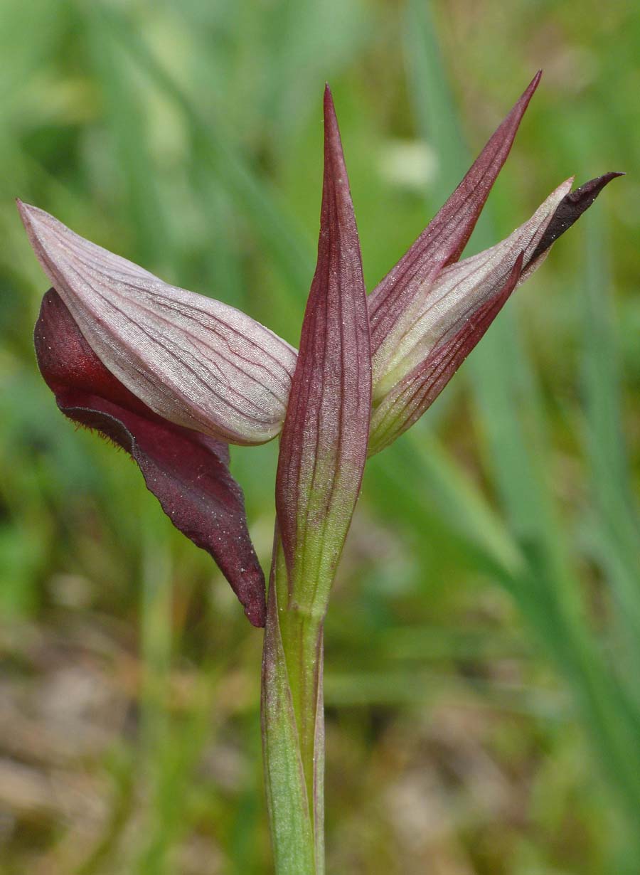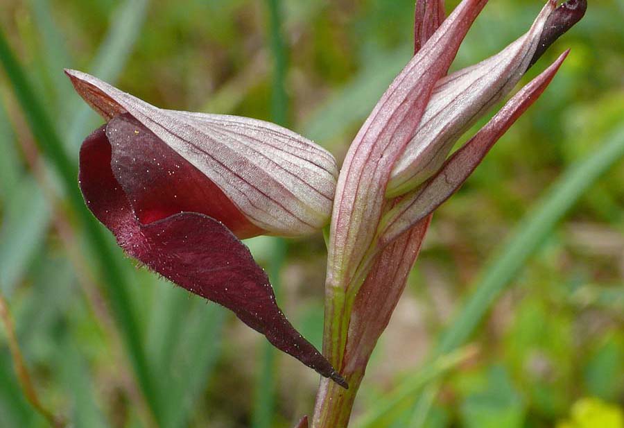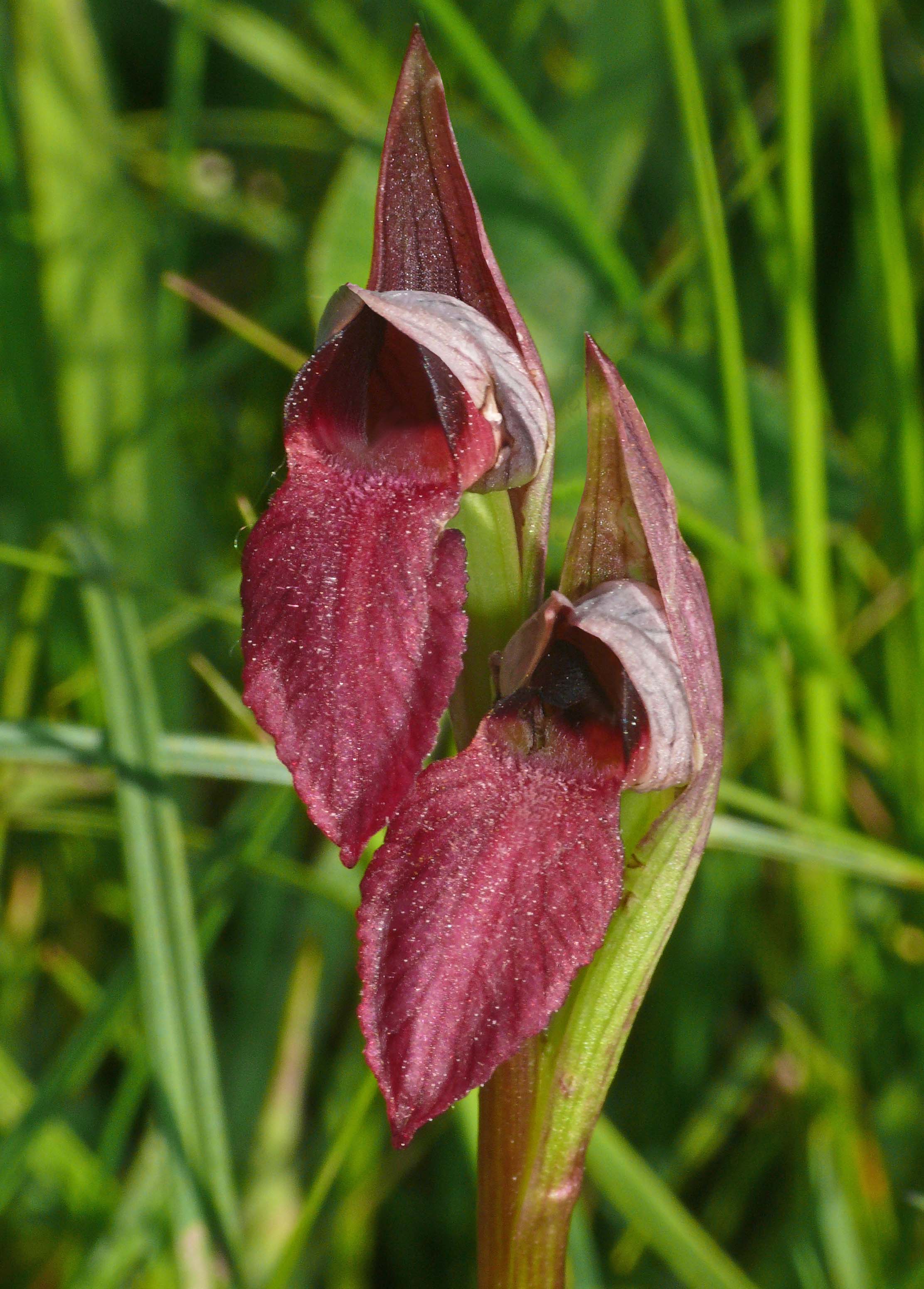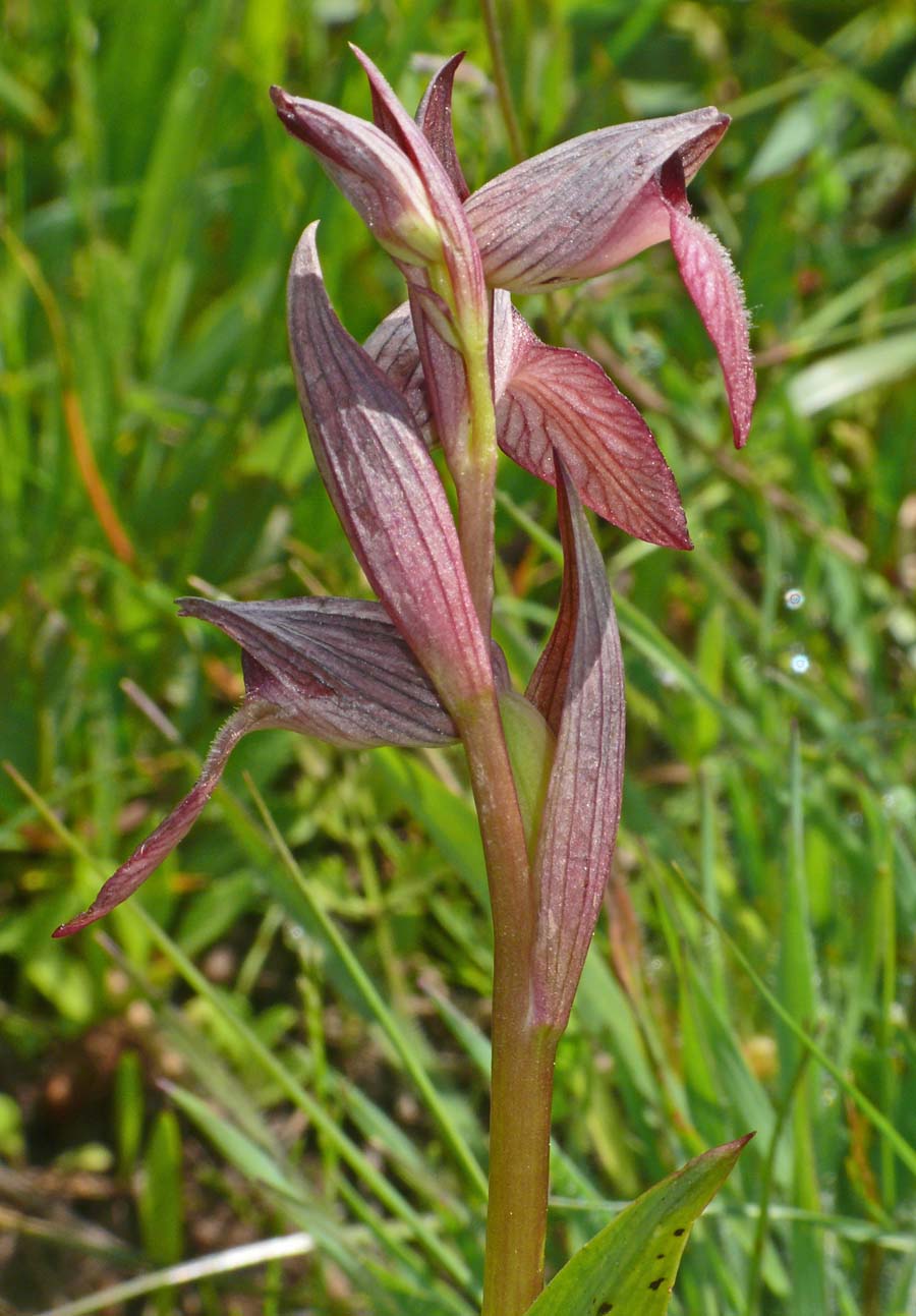 This species is endemic to southern France and more particularly to the coast and hinterland of the provinces of Var and Alpes-Maritimes where it shows a preference for a sunny position in damp habitats on acidic, siliceous or sandy soils. The moist conditions found in dune slacks, the borders of marshes and damp meadows are preferred but it will also tolerate significantly drier conditions, even garrigue when near the coast. S. olbia is thought to be of hybrid origin with S. neglecta and S. lingua as the assumed and probably ancient progenitors. Its hybridogenous heritage can be noted in its appearance and so will often exhibit features that more strongly reflect the characteristics of one or other of its parents. Typically however it is a distinctive orchid carrying up to five individual flowers (more usually two) with grey lined hoods and a brick red, hairy epichile. As cautioned earlier, it will frequently betray its S. lingua roots and sport a pink or lighter coloured, less hirsute tongue. Except in the wettest conditions, the leaves shrivel quite quickly, leaving a characteristically long stem up to 30cms high and typically with a pair of oppositely placed flowers at the top. S. olbia flowers in April and May. These pictures come from damp meadows around Bagnols-en-Foret, Var, dating from the first two weeks of May. |