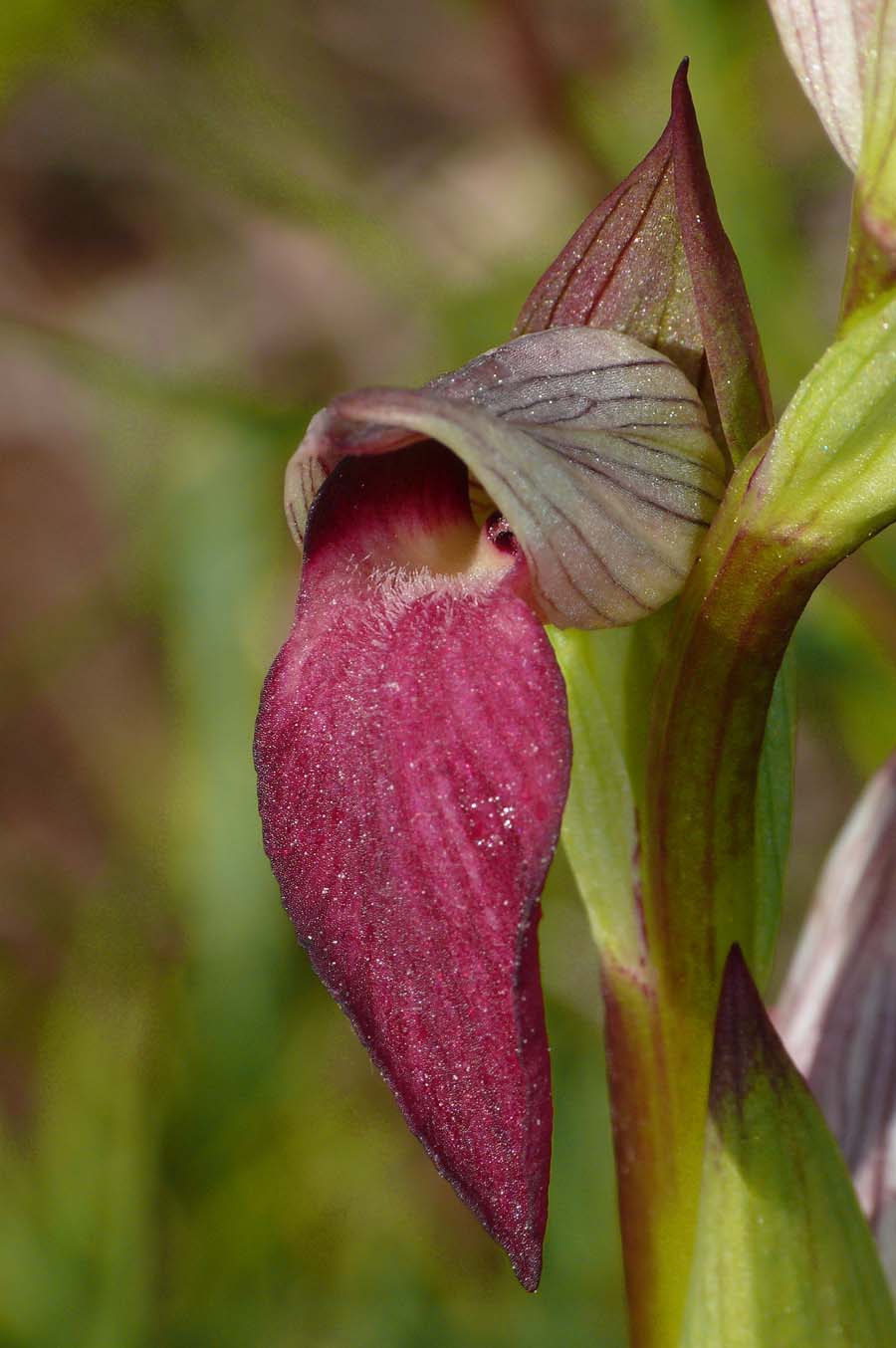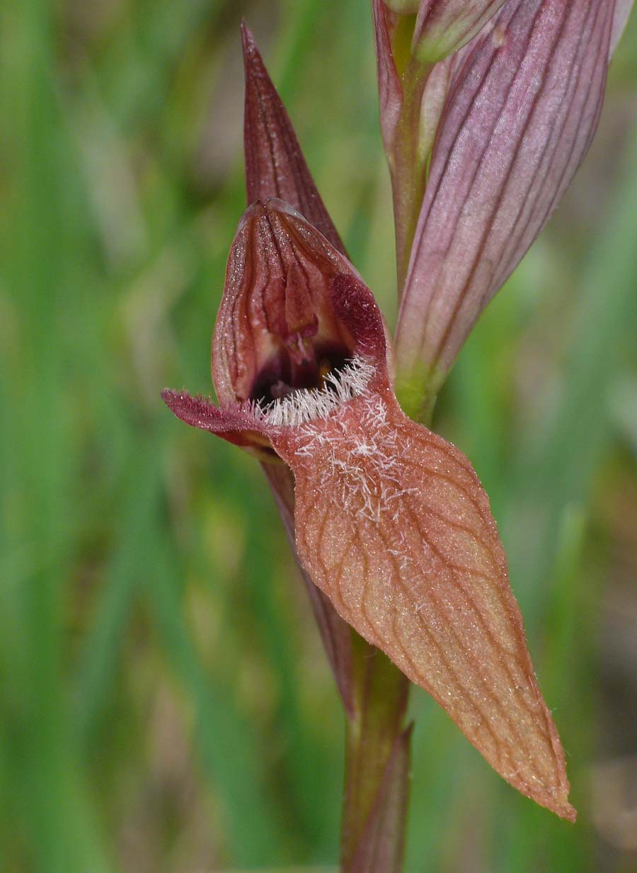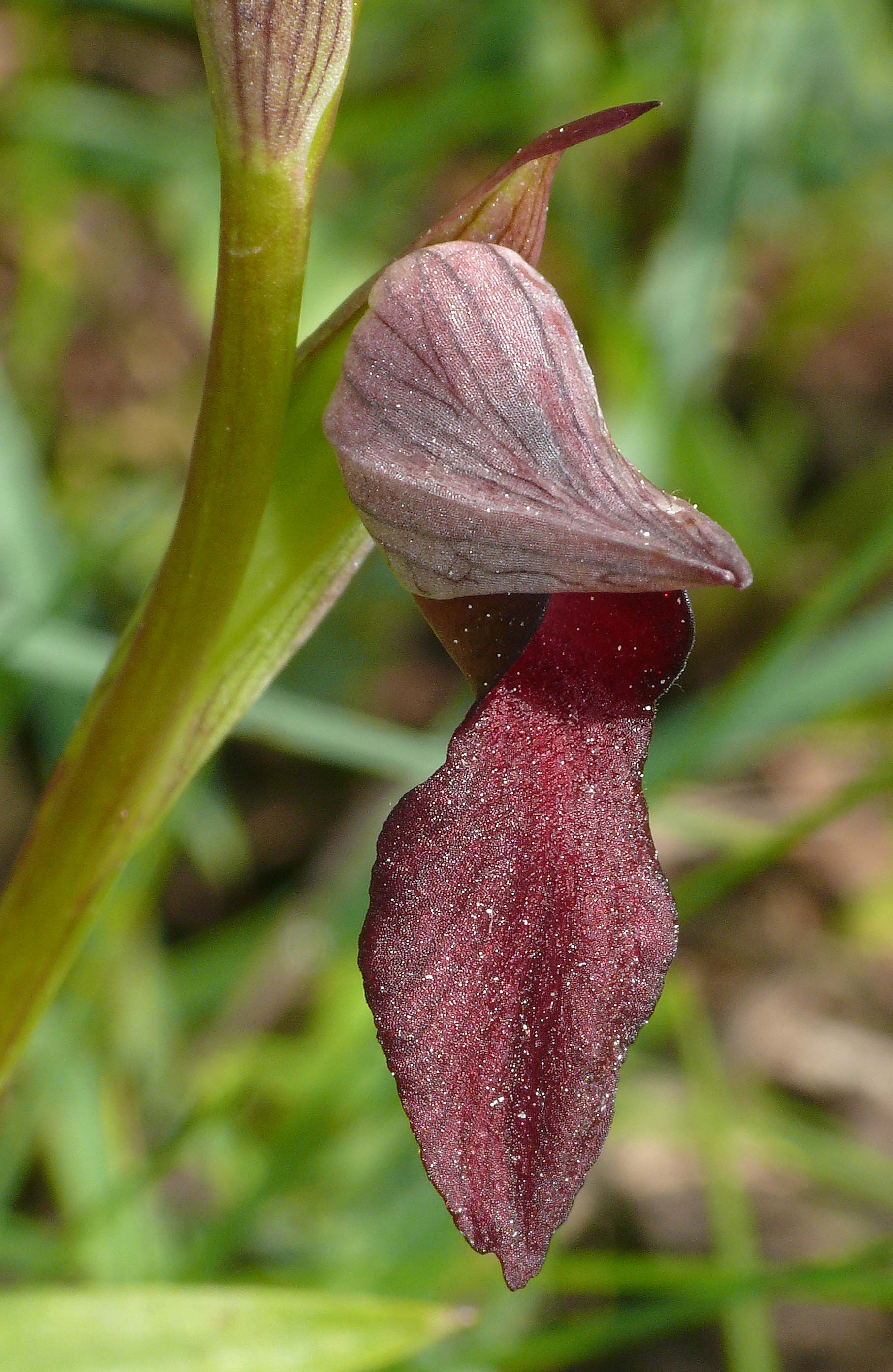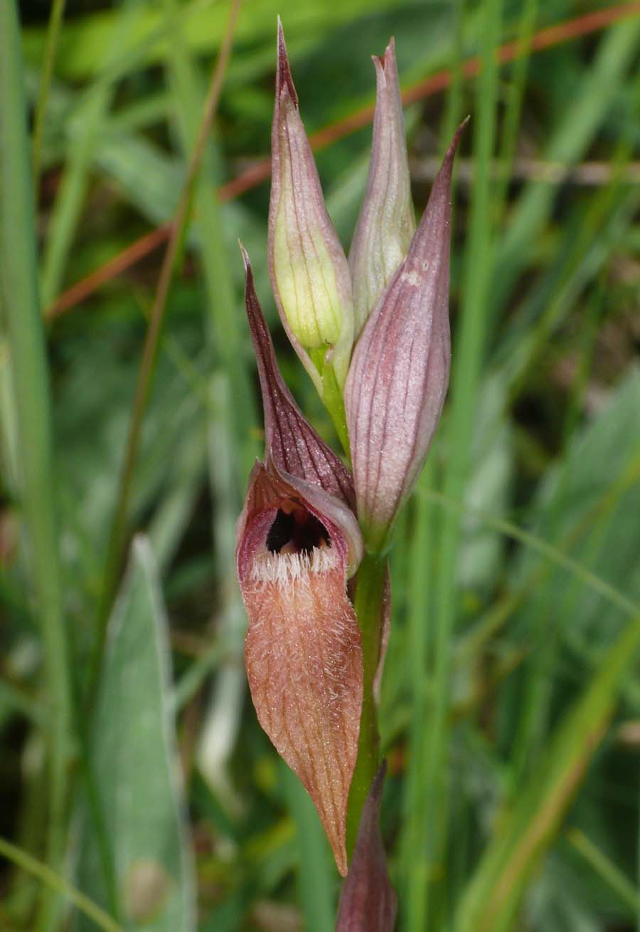 This species is endemic to southern France and more particularly to the coast and hinterland of the provinces of Var and Alpes-Maritimes where it shows a preference for a sunny position in damp habitats on acidic, siliceous or sandy soils. The moist conditions found in dune slacks, the borders of marshes and damp meadows are preferred but it will also tolerate significantly drier conditions, even garrigue when near the coast. S. olbia is thought to be of hybrid origin with S. neglecta and S. lingua as the assumed and probably ancient progenitors. Its hybridogenous heritage can be noted in its appearance and so will often exhibit features that more strongly reflect the characteristics of one or other of its parents. Typically however it is a distinctive orchid carrying up to five individual flowers (more usually two) with grey lined hoods and a brick red, hairy epichile. As cautioned earlier, it will frequently betray its S. lingua roots and sport a pink or lighter coloured, less hirsute tongue. Except in the wettest conditions, the leaves shrivel quite quickly, leaving a characteristically long stem up to 30cms high and typically with a pair of oppositely placed flowers at the top. S. olbia flowers in April and May. These pictures come from damp meadows around Bagnols-en-Foret, Var, dating from the first two weeks of May. |