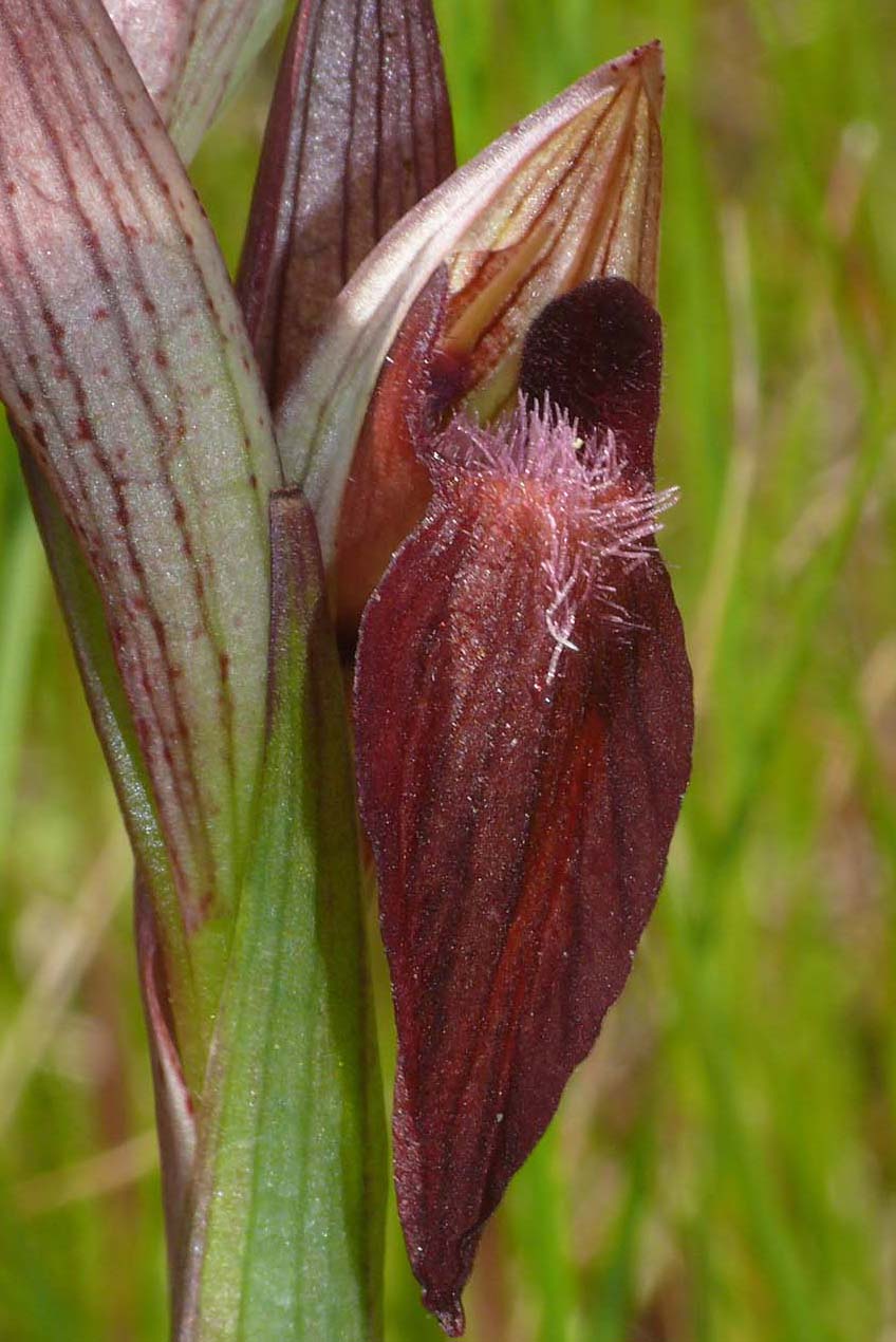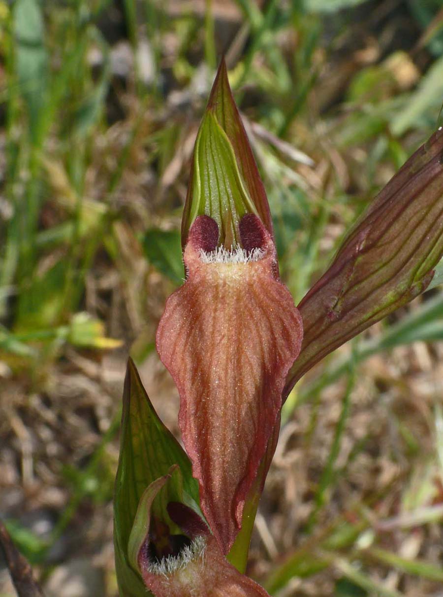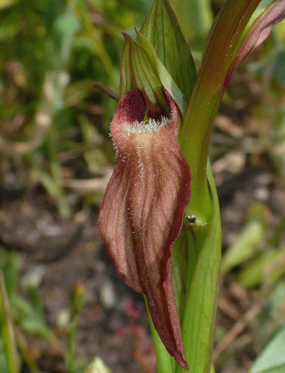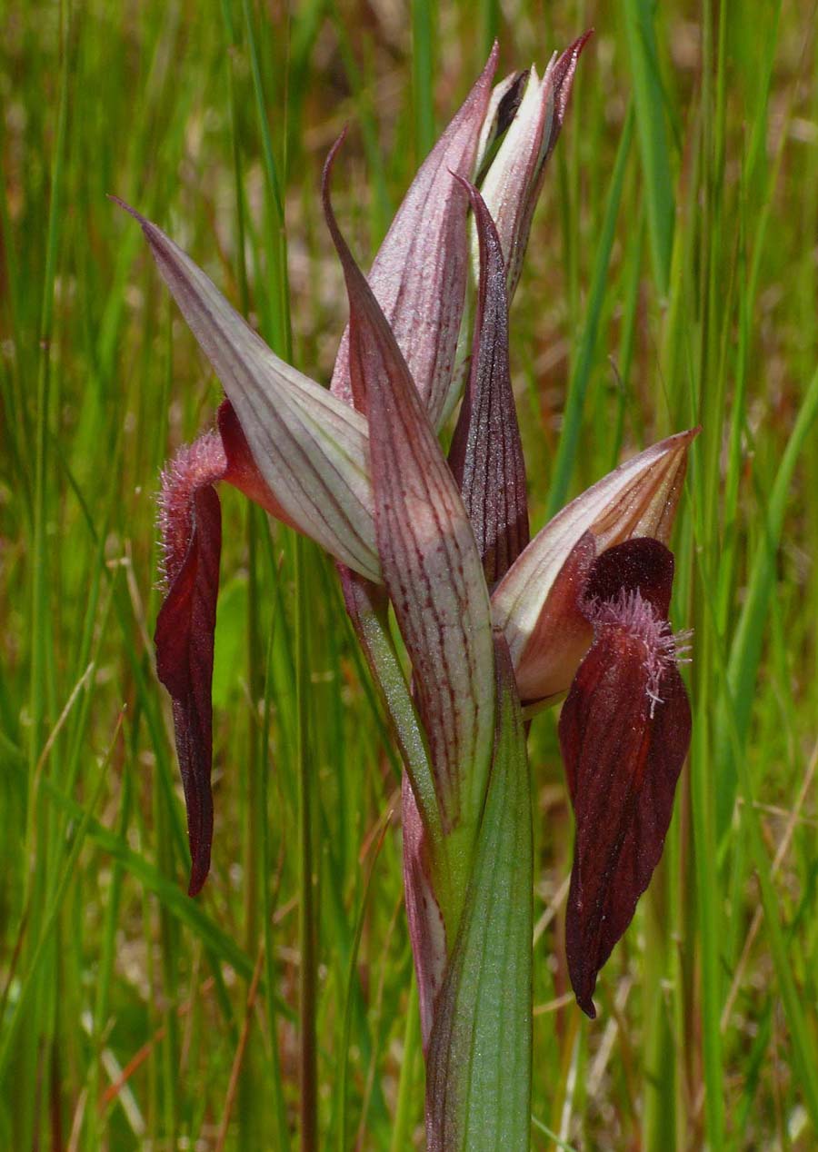S. siciliensis was first described from Caltanissetta, Sicily by Bartolo and Pulvirenti as S. orientalis var. siciliensis in 1972 and its name refers to the Mediterranean island of Sicily. It has a narrow distribution limited to the south of Sicily although similar plants are also known from southern peninsular Italy but whose correct status is still to be confirmed. S. siciliensis is a somewhat variable species which although readily identifiable in its typical form (as depicted opposite) can often exhibit detail differences which bring it morphologically close to S. vomeracea. The suspicion is course that as is so common with the Serapias family, inter-specific hybridization and introgression has occured. Pictures two and six depict examples which portray features intermediate between S. siciliensis and S. vomeracea. S. siciliensis occurs only in the south of the island and is recognizably a member of the S. orientalis group of Serapias with a relatively stout appearance but with a compact inflorescence of few flowers, normally between three and six individuals condensed up the stem. The epichile is broad, downward pointing (rarely recurved) and extremely hairy at the junction of epichile and hypochile. Colouration is dark red to lighter brown but the species can exhibit anthocyanin deficiency albeit not as commonly as its eastern relative, The bract length varies from being equal to hood length to marginally longer. Although not illustrated in these photographs, the leaves are generally larger than in S. orientalis and form a rosette at the base from which rise sheathing leaves that usually reach the lowermost flowers. The pictures are all from southern Sicily and date from the beginning of April. |