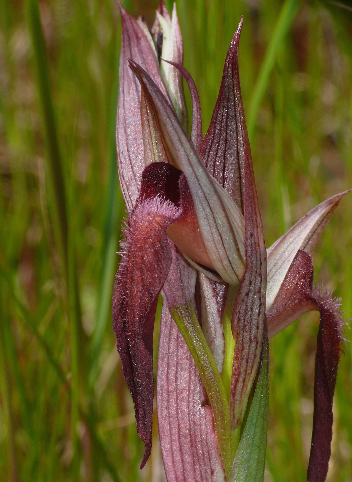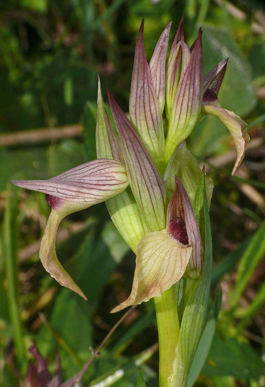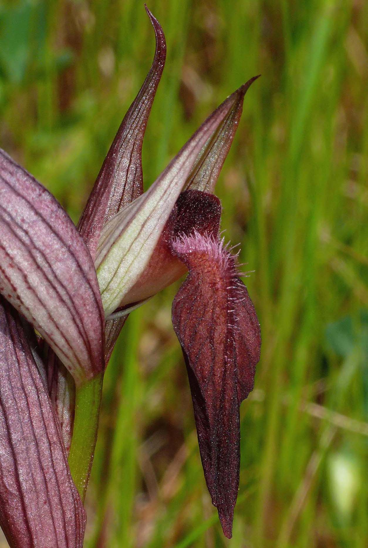 S. siciliensis was first described from Caltanissetta, Sicily by Bartolo and Pulvirenti as S. orientalis var. siciliensis in 1972 and its name refers to the Mediterranean island of Sicily. It has a narrow distribution limited to the south of Sicily although similar plants are also known from southern peninsular Italy but whose correct status is still to be confirmed. S. siciliensis is a somewhat variable species which although readily identifiable in its typical form (as depicted opposite) can often exhibit detail differences which bring it morphologically close to S. vomeracea. The suspicion is course that as is so common with the Serapias family, inter-specific hybridization and introgression has occured. Pictures two and six depict examples which portray features intermediate between S. siciliensis and S. vomeracea. S. siciliensis occurs only in the south of the island and is recognizably a member of the S. orientalis group of Serapias with a relatively stout appearance but with a compact inflorescence of few flowers, normally between three and six individuals condensed up the stem. The epichile is broad, downward pointing (rarely recurved) and extremely hairy at the junction of epichile and hypochile. Colouration is dark red to lighter brown but the species can exhibit anthocyanin deficiency albeit not as commonly as its eastern relative, The bract length varies from being equal to hood length to marginally longer. Although not illustrated in these photographs, the leaves are generally larger than in S. orientalis and form a rosette at the base from which rise sheathing leaves that usually reach the lowermost flowers. The pictures are all from southern Sicily and date from the beginning of April. |